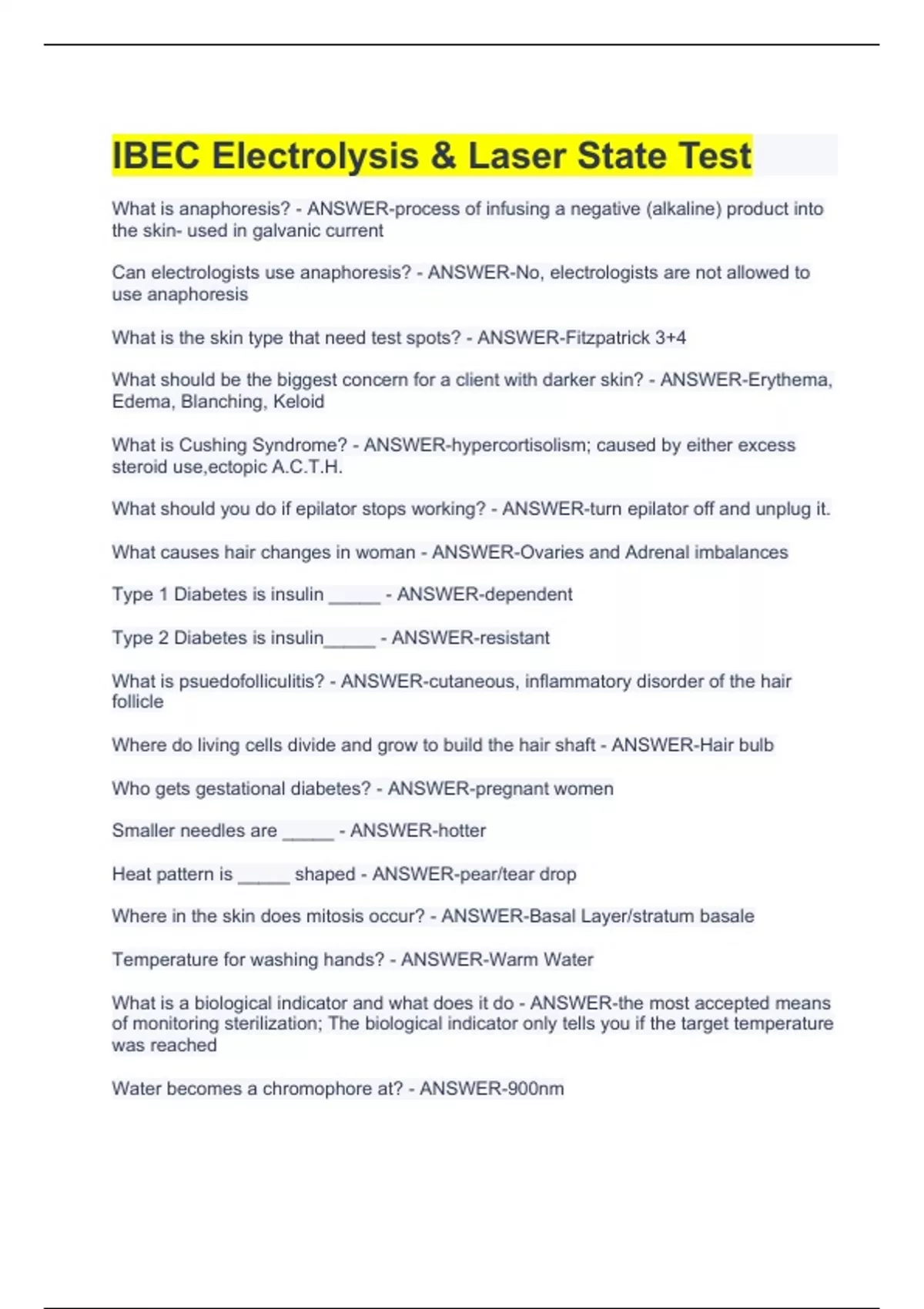 What is anaphoresis? - ANSWER-process of infusing a negative (alkaline) product into the skin- used in galvanic current Can electrologists use anaphoresis? - ANSWER-No, electrologists are not allowed to use anaphoresis What is the skin type that need test spots? - ANSWER-Fitzpatrick 3+4 What should be the biggest concern for a client with darker skin? - ANSWER-Erythema, Edema, Blanching, Keloid What is Cushing Syndrome? - ANSWER-hypercortisolism; caused by either excess steroid use,ectopic A.C.T.H. What should you do if epilator stops working? - ANSWER-turn epilator off and unplug it. What causes hair changes in woman - ANSWER-Ovaries and Adrenal imbalances Type 1 Diabetes is insulin _____ - ANSWER-dependent Type 2 Diabetes is insulin_____ - ANSWER-resistant