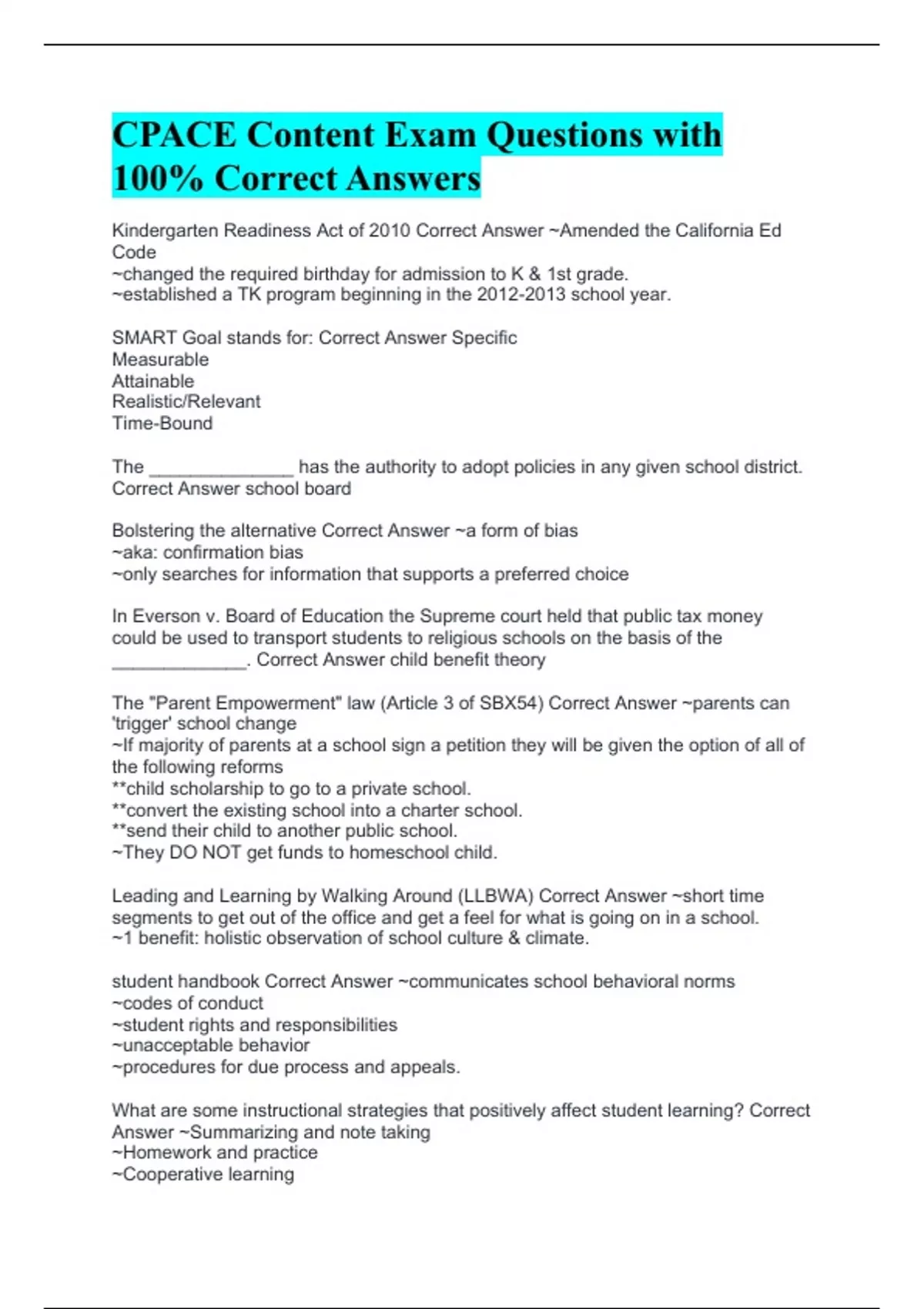 Kindergarten Readiness Act of 2010 Correct Answer ~Amended the California Ed Code ~changed the required birthday for admission to K & 1st grade. ~established a TK program beginning in the school year. SMART Goal stands for: Correct Answer Specific Measurable Attainable Realistic/Relevant Time-Bound The ______________ has the authority to adopt policies in any given school district. Correct Answer school board Bolstering the alternative Correct Answer ~a form of bias ~aka: confirmation bias ~only searches for information that supports a preferred choice In Everson v. Board of Education the Supreme court held that public tax money could be used to transport students to religious schools on the basis of the _____________. Correct Answer child benefit theory The "Parent Empowerment" law (Article 3 of SBX54) Correct Answer ~parents can 'trigger' school change ~If majority of parents at a school sign a petition they will be given the option of all of the following reforms **child scholarship to go to a private school. **convert the existing school into a charter school. **send their child to another public school. ~They DO NOT get funds to homeschool child. Leading and Learning by Walking Around (LLBWA) Correct Answer ~short time segments to get out of the office and get a feel for what is going on in a school. ~1 benefit: holistic observation of school culture & climate. student handbook Correct Answer ~communicates school behavioral norms ~codes of conduct ~student rights and responsibilities ~unacceptable behavior ~procedures for due process and appeals. What are some instructional strategies that positively affect student learning? Correct Answer ~Summarizing and note taking ~Homework and practice ~Cooperative learning