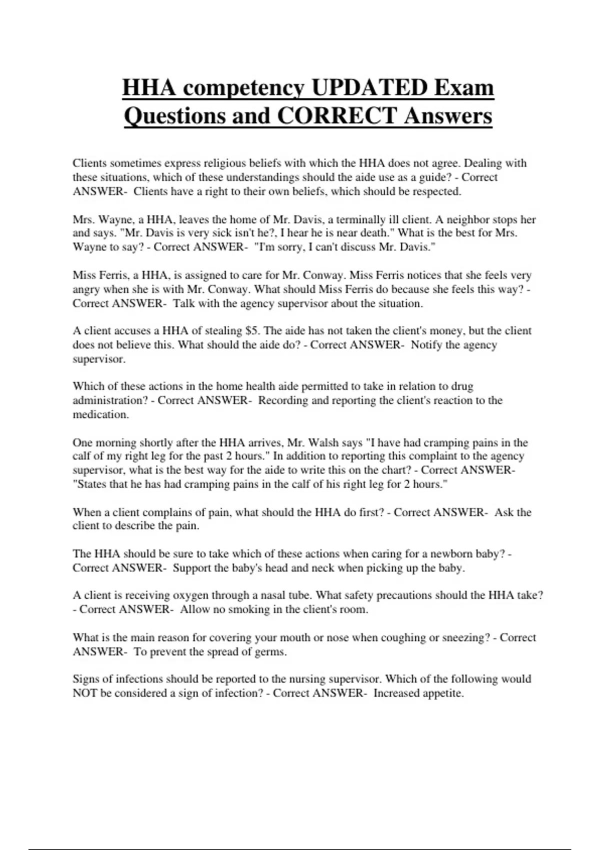 HHA competency UPDATED Exam Questions and CORRECT Answers Clients sometimes express religious beliefs with which the HHA does not agree. Dealing with these situations, which of these understandings should the aide use as a guide? - Correct ANSWER- Clients have a right to their own beliefs, which should be respected. Mrs. Wayne, a HHA, leaves the home of Mr. Davis, a terminally ill client. A neighbor stops her and says. "Mr. Davis is very sick isn't he?, I hear he is near death." What is the best for Mrs. Wayne to say? - Correct ANSWER- "I'm sorry, I can't discuss Mr. Davis."