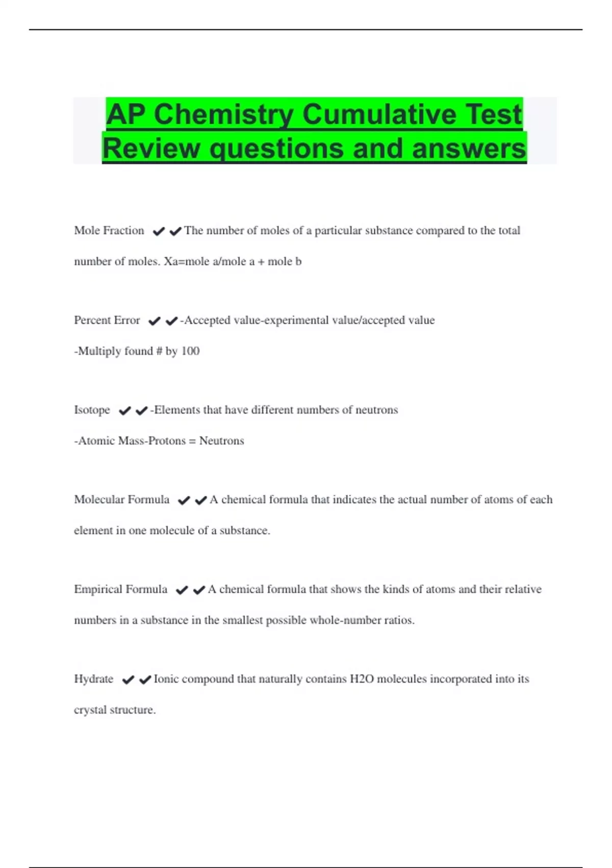 AP Chemistry Cumulative Test Review questions and answers Mole Fraction ️️The number of moles of a particular substance compared to the total number of moles. Xa=mole a/mole a + mole b Percent Error ️️-Accepted value-experimental value/accepted value -Multiply found # by 100 Isotope ️️-Elements that have different numbers of neutrons -Atomic Mass-Protons = Neutrons Molecular Formula ️️A chemical formula that indicates the actual number of atoms of each element in one molecule of a substance. Empirical Formula ️️A chemical formula that shows the kinds of atoms and their relative numbers in a substance in the smallest possible whole-number ratios