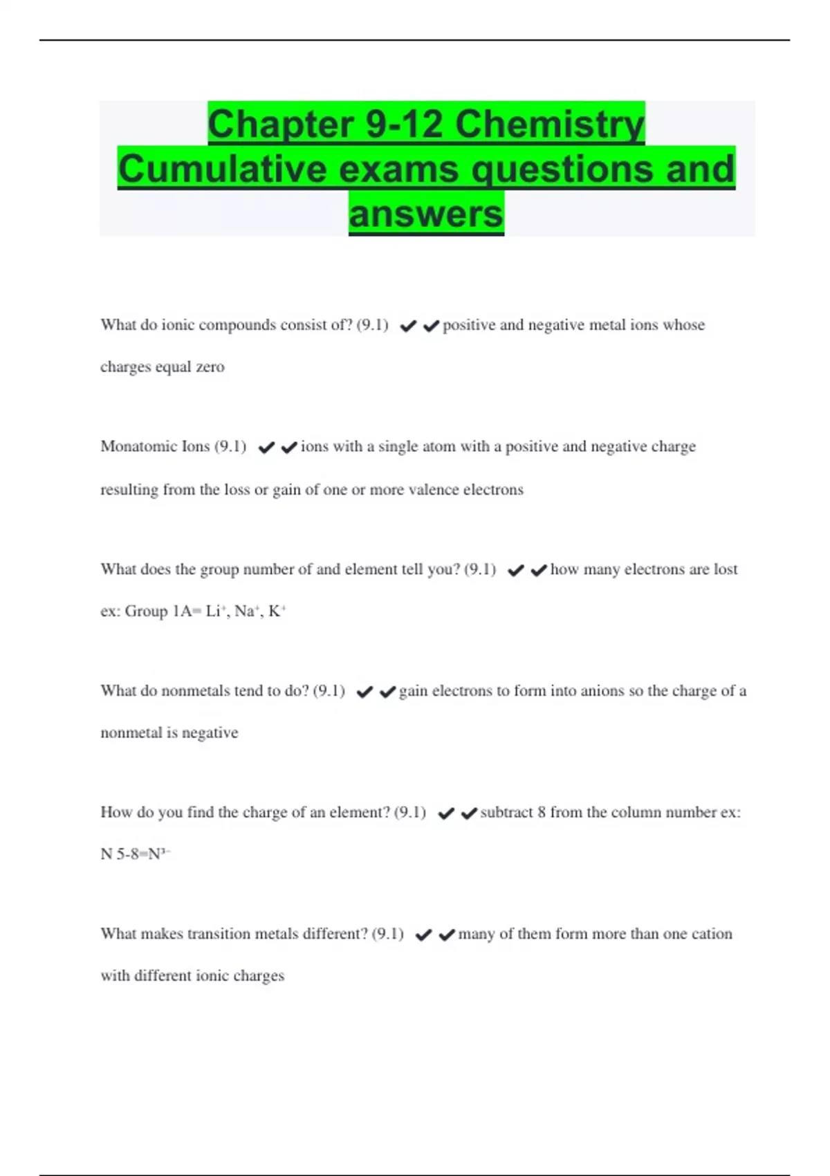Chapter 9-12 Chemistry Cumulative exams questions and answers What do ionic compounds consist of? (9.1) ️️positive and negative metal ions whose charges equal zero Monatomic Ions (9.1) ️️ions with a single atom with a positive and negative charge resulting from the loss or gain of one or more valence electrons What does the group number of and element tell you? (9.1) ️️how many electrons are lost ex: Group 1A= Li⁺, Na⁺, K⁺ What do nonmetals tend to do? (9.1) ️️gain electrons to form into anions so the charge of a nonmetal is negative