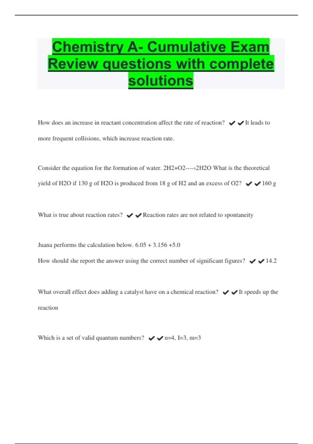 Chemistry A- Cumulative Exam Review questions with complete solutions How does an increase in reactant concentration affect the rate of reaction? ️️It leads to more frequent collisions, which increase reaction rate. Consider the equation for the formation of water. 2H2+O2----›2H2O What is the theoretical yield of H2O if 130 g of H2O is produced from 18 g of H2 and an excess of O2? ️️160 g What is true about reaction rates? ️️Reaction rates are not related to spontaneity Juana performs the calculation below. 6.05 + 3.156 +5.0 How should she report the answer using the correct number of significant figures? ️️14.2