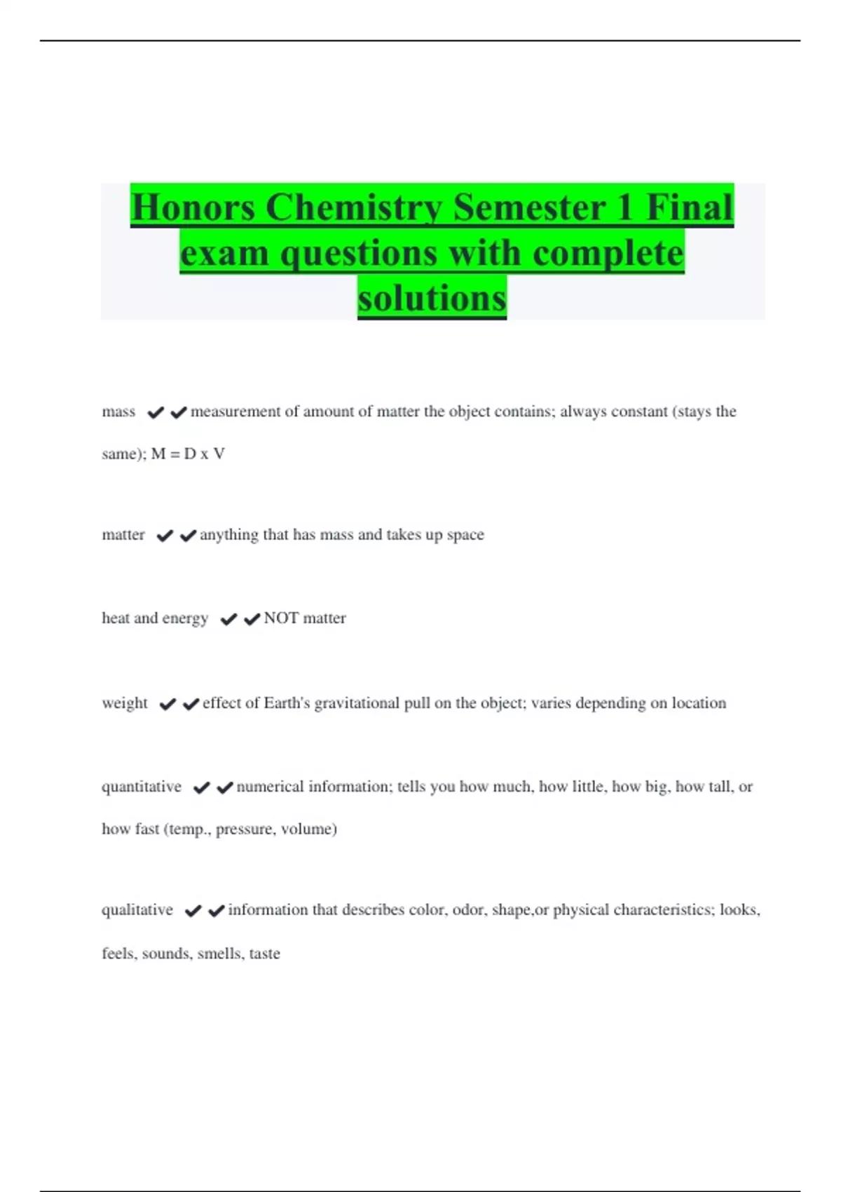 Honors Chemistry Semester 1 Final exam questions with complete solutions mass ️️measurement of amount of matter the object contains; always constant (stays the same); M = D x V matter ️️anything that has mass and takes up space heat and energy ️️NOT matter weight ️️effect of Earth's gravitational pull on the object; varies depending on location quantitative ️️numerical information; tells you how much, how little, how big, how tall, or how fast (temp., pressure, volume)