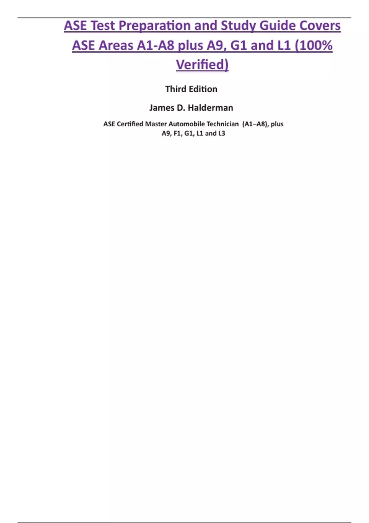 ASE Test Preparation and Study Guide Covers ASE Areas A1-A8 plus A9, G1 and L1 (100% Verified) Third Edition James D. Halderman ASE Certified Master Automobile Technician (A1–A8), plus A9, F1, G1, L1 and L3