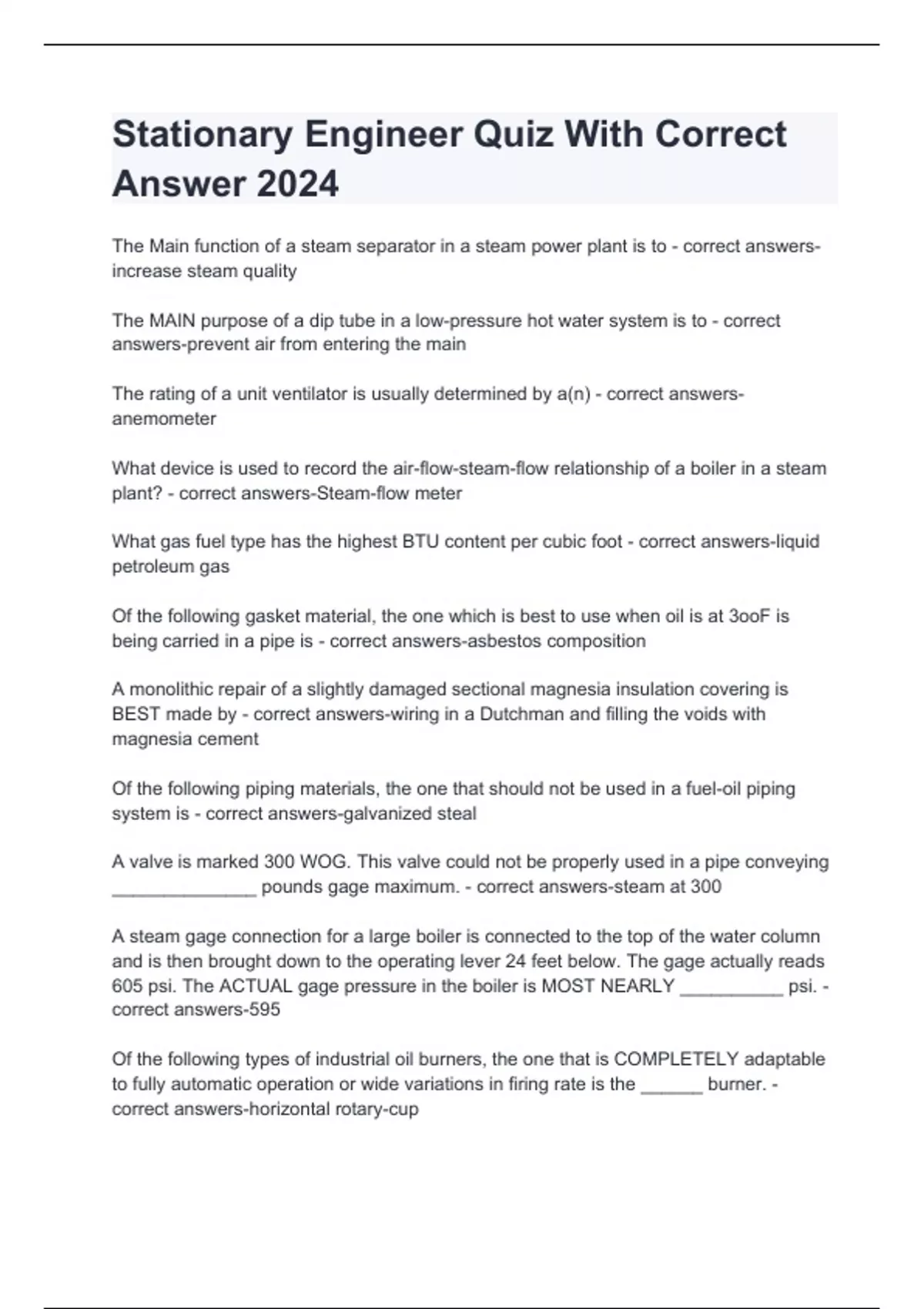 Stationary Engineer Quiz With Correct Answer 2024