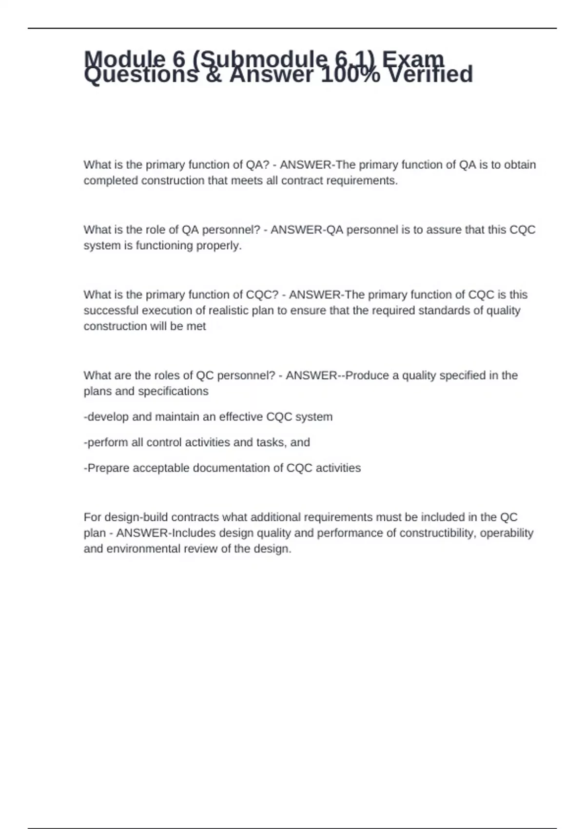 What is the primary function of QA? - ANSWER-The primary function of QA is to obtain completed construction that meets all contract requirements. What is the role of QA personnel? - ANSWER-QA personnel is to assure that this CQC system is functioning properly. What is the primary function of CQC? - ANSWER-The primary function of CQC is this successful execution of realistic plan to ensure that the required standards of quality construction will be met What are the roles of QC personnel? - ANSWER--Produce a quality specified in the plans and specifications -develop and maintain an effective CQC system -perform all control activities and tasks, and -Prepare acceptable documentation of CQC activities For design-build contracts what additional requirements must be included in the QC plan - ANSWER-Includes design quality and performance of constructibility, operability and environmental review of the design.