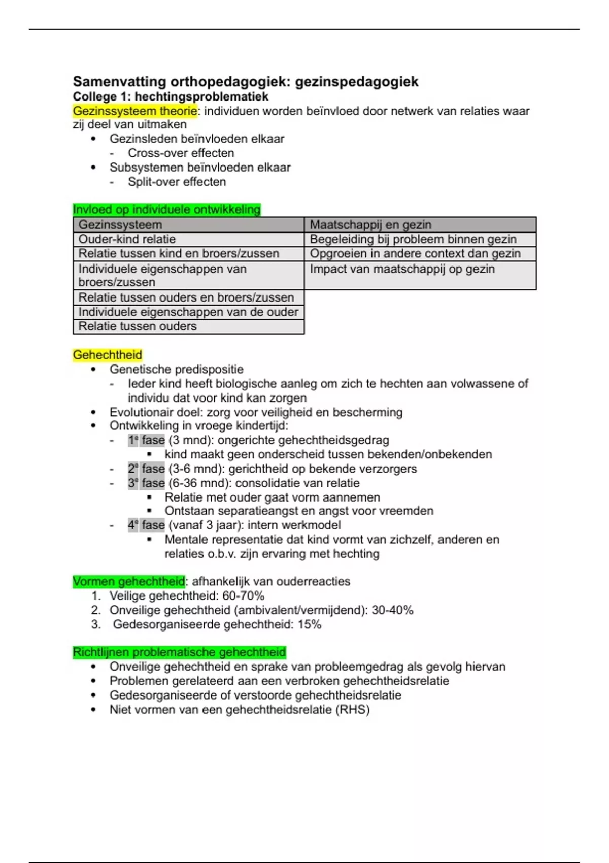 Deze samenvatting (+ aantekeningen van hoorcolleges) is bedoeld voor studenten die de opleiding Pedagogische wetenschappen volgen aan Universiteit Leiden en in het 2e leerjaar zitten. Het bevat de stof dat wordt getoetst voor het vak orthopedagogiek: gezinsfactoren in blok 4. Literatuur dat hiervoor is gebruikt: 1. Humphreys et al. (2017). Signs of reactive attachment disorder and disinhibited social engagement disorder at age 12 years: Effects of institutional care history and high-quality foster care. 2. Seim et al. (2022). Reactive attachment disorder and disinhibited social engagement disorder in adolescence: Co-occurring psychopathology and psychosocial problems. 3. Buist et al. (2013). Sibling relationship quality and psychopathology of children and adolescents: A meta-analysis. 4. Van Berkel et al. (2018). The combination of sibling victimization and parental child maltreatment on mental health problems and delinquency. 5. Hayden et al. (2019). A population-based study of the behavioral and emotional adjustment of older siblings of children with and without intellectual disability. 6. Richtlijn Scheiding en problemen van jeugdigen voor jeugdhulp en jeugdbescherming: H 2, 3 en 4 7. Van Dijk et al. (2020). A meta-analysis on interparental conflict, parenting, and child adjustment in divorced families: Examining mediation using meta-analytic structural equation models. 8. Jiao et al. (2021). Dyadic relationships between a surviving parent and children in widowed families: A systematic scoping review. 9. Stikkelbroek et al. (2016). Mental health of adolescents before and after the death of a parent or sibling. 10. Van Heijningen et al. (2023). Long-term effects of experiencing childhood parental death on mental and physical health: A NESDA study. 11. Bouma et al. (2017). HESTIA Factsheet: Het Nederlandse jeugdbeschermingsstelsel onder de Jeugdwet 2015. 12. Koper et al. (2024). Effectiveness of a multidisciplinary treatment with youth-initiated mentoring for youths with mental health needs from multi-problem families: a quasi-experimental study. 13. Van Assen et al.(2020). Home-visiting interventions for families with complex and multiple problems: A systematic review and meta-analysis of out-of-home placement and child outcomes. 14. Emmelkamp et al. (2020). Risk factors for (violent) radicalization in juveniles: A multilevel meta-analysis. 15. Zych en Nasaescu (2022). s radicalization a family issue? A systematic review of family‐related risk and protective factors, consequences, and interventions against radicalization. 16. Sikkens et al. (2018). Parents’ perspectives on radicalization: A qualitative study. 17. Richtlijn Kinderen van Ouders met Psychische Problemen / Verslavingsproblemen (KOPP/KOV) voor jeugdhulp en jeugdbescherming: H 2, 3, 4 en 5 18. Leijdesdorff et al. (2017). Prevalence of psychopathology in children of parents with mental illness and/or addiction: an up to date narrative review. 19. Källquist en Salzmann-Erikson (2019). Experiences of having a parent with serious mental illness: an interpretive meta-synthesis of qualitative literature. 20. Van Santvoort et al. (2015). The impact of various parental mental disorders on children’s diagnoses: a systematic review. 21. Assink et al. (2018). The intergenerational transmission of child maltreatment: A three-level meta-analysis. 22. Lebowitz et al. (2016). Cross-generational influences on childhood anxiety disorders: pathways and mechanisms. 23. Asif et al. (2024). Influence of placement stability on developmental outcomes of children and young people in out-of-home care: Findings from the Pathways of Care Longitudinal Study. 24. Dubois-Comtois et al. (2021). Are children and adolescents in foster care at greater risk of mental health problems than their counterparts? A meta-analysis. 25. Gutterswijk et al. (2020). The outcome of non-residential youth care compared to residential youth care: A multilevel meta-analysis. De kleuren in de tekst geven belangrijke punten aan. Geel: belangrijk onderwerp/begrip Groen: subonderwerp/hoort bij belangrijk begrip Grijs: overige belangrijke woorden/woorden die bij groen horen Roze: belangrijke personen