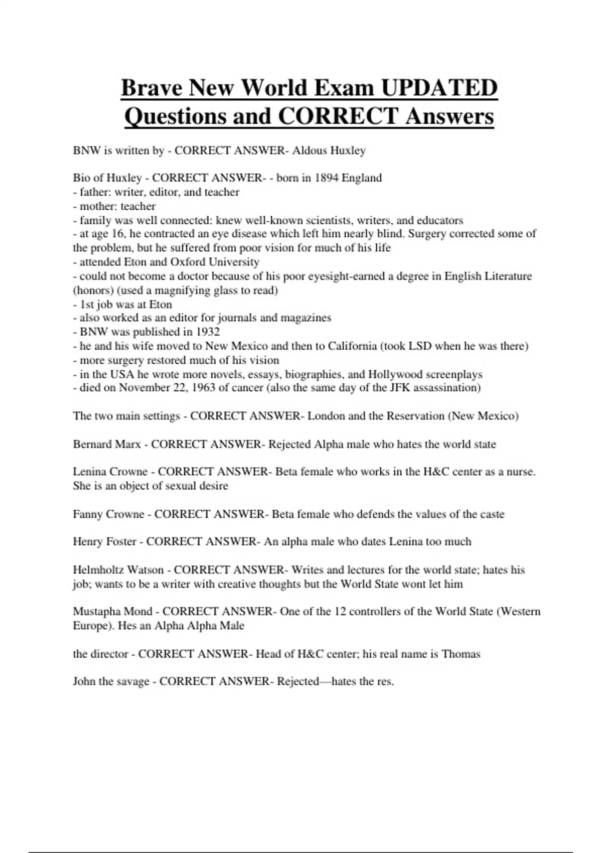 Brave New World Exam UPDATED Questions and CORRECT Answers BNW is written by - CORRECT ANSWER- Aldous Huxley Bio of Huxley - CORRECT ANSWER- - born in 1894 England - father: writer, editor, and teacher - mother: teacher - family was well connected: knew well-known scientists, writers, and educators - at age 16, he contracted an eye disease which left him nearly blind. Surgery corrected some of the problem, but he suffered from poor vision for much of his life - attended Eton and Oxford University - could not become a doctor because of his poor eyesight-earned a degree in English Literature (honors) (used a magnifying glass to read) - 1st job was at Eton - also worked as an editor for journals and magazines