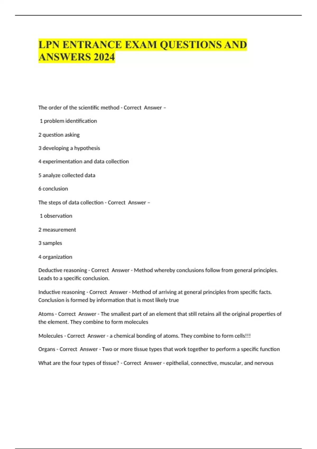 LPN ENTRANCE EXAM QUESTIONS AND ANSWERS 2024