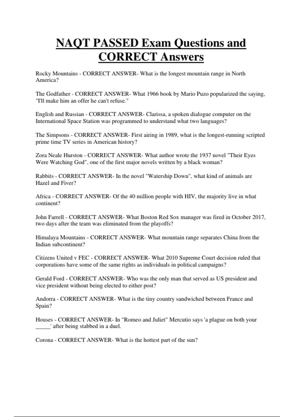 NAQT PASSED Exam Questions and CORRECT Answers Rocky Mountains - CORRECT ANSWER- What is the longest mountain range in North America? The Godfather - CORRECT ANSWER- What 1966 book by Mario Puzo popularized the saying, "I'll make him an offer he can't refuse." English and Russian - CORRECT ANSWER- Clarissa, a spoken dialogue computer on the International Space Station was programmed to understand what two languages? The Simpsons - CORRECT ANSWER- First airing in 1989, what is the longest-running scripted prime time TV series in American history?