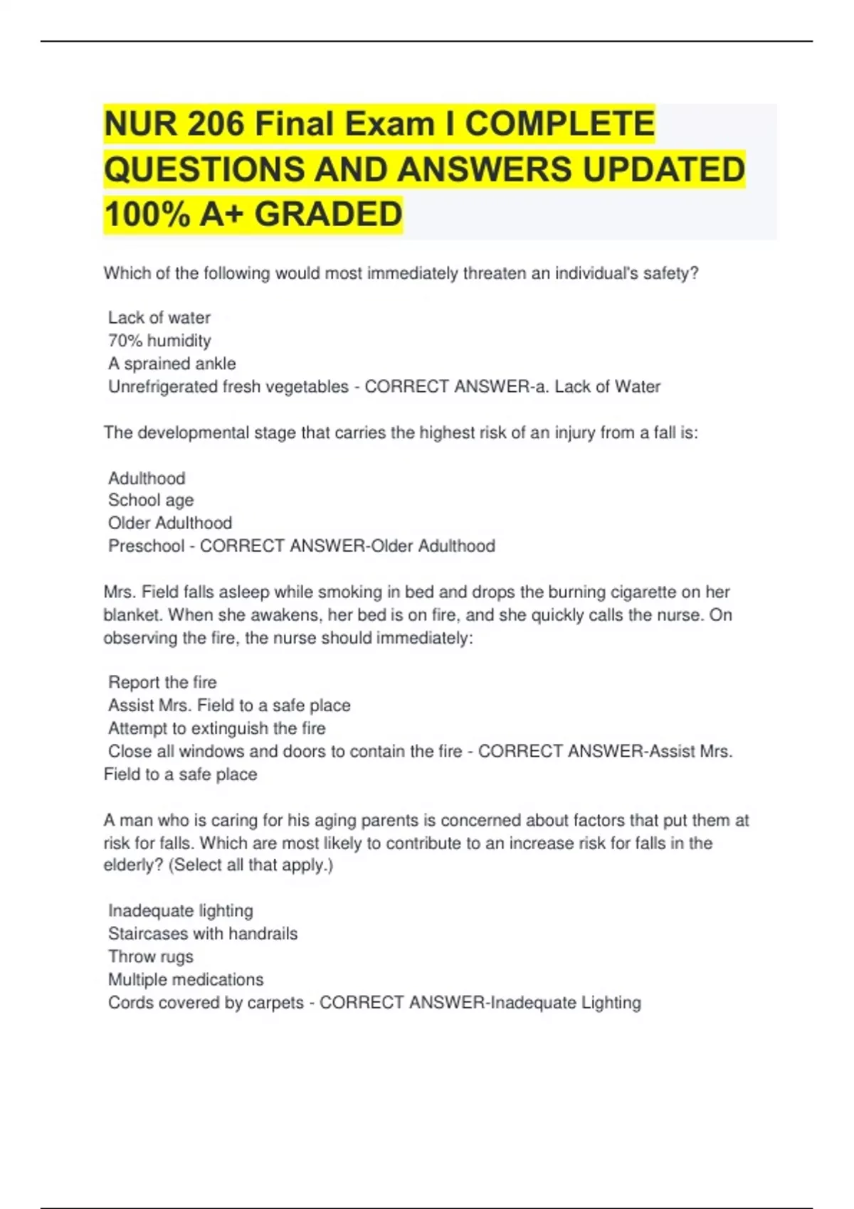 NUR 206 Final Exam I COMPLETE QUESTIONS AND ANSWERS UPDATED 100% A+ GRADED Which of the following would most immediately threaten an individual's safety? Lack of water 70% humidity A sprained ankle Unrefrigerated fresh vegetables - CORRECT ANSWER-a. Lack of Water The developmental stage that carries the highest risk of an injury from a fall is: Adulthood School age Older Adulthood Preschool - CORRECT ANSWER-Older Adulthood Mrs. Field falls asleep while smoking in bed and drops the burning cigarette on her blanket. When she awakens, her bed is on fire, and she quickly calls the nurse. On observing the fire, the nurse should immediately: Report the fire Assist Mrs. Field to a safe place Attempt to extinguish the fire Close all windows and doors to contain the fire - CORRECT ANSWER-Assist Mrs. Field to a safe place A man who is caring for his aging parents is concerned about factors that put them at risk for falls. Which are most likely to contribute to an increase risk for falls in the elderly? (Select all that apply.) Inadequate lighting Staircases with handrails Throw rugs Multiple medications Cords covered by carpets - CORRECT ANSWER-Inadequate Lighting Throw Rugs Multiple Medications Cords Covered by Carpets At 3 pm, the Emergency department nurse hears that an explosion has occurred at the local milk plant. Which action does the nurse take first? Contact the American Red Cross Determine how to resume normal operations Evacuate patients per the disaster plan Prepare for an influx of patients - CORRECT ANSWER-Prepare for an Influx of Patients Mr. Green, a 62-year-old farmer, has been hospitalized for 2 weeks for thrombophlebitis. He has no visitors, and the nurse notices that he appears bored, restless, and anxious. The type of alteration occurring because of sensory deprivation is: Cognitive Affective Receptual Perceptual - CORRECT ANSWER-Affective Which of the following would not provide meaningful stimuli for a patient? Interesting magazines and books A clock or a calendar with large numbers Family pictures and personal possessions A television kept on all day at low volume - CORRECT ANSWER-A television kept on all day at low volume Patients with existing sensory loss must be protected from injury. What determines the safety precautions taken? The existing dangers in the environment The financial means to make needed safety changes The nature of the patient's actual or potential sensory loss The availability of a support system to enable the patient to exist in his or her present environment - CORRECT ANSWER-The nature of the patient's actual or potential sensory loss A patient who is unable to name common objects or express simple ideas in writing or words has: Global aphasia Receptive aphasia Mental retardation Expressive aphasia - CORRECT ANSWER-Expressive Aphasia Mrs. DeLone states he is worried about his parents' plans to retire. All of the following would be appropriate responses regarding retirement of older adults except: Retirement may affect an individual's physical and psychological functioning Positive adjustment is often related to how much a person planned for the retirement Reactions to retirement are influenced by the importance that has been attached to the work role Retirement for most persons represents a sudden shock that is irreversibly damaging to self-image and self-esteem - CORRECT ANSWER-Retirement for most persons represents a sudden shock that is irreversibly damaging to self-image and self-esteem. Mr. Brown is having some difficulty breathing. The nurse most appropriately assists him into the: Fowler's position lateral position dorsal recumbent Sims' position - CORRECT ANSWER-Fowler's Position Mrs. Eden tells the nurse that she feels faint and unsteady while walking in the corridor with the nurse. The nurse: Advises her to look down at her feet to help maintain her balance Provide a wide base of support with one foot in front of the other, and ease her to the floor Leaves her momentarily to find another nurse for help Instructs the patient to quicken her pace so they can return to her room - CORRECT ANSWER-Provide a wide base of support with one food in front of the other, and ease her to the floor