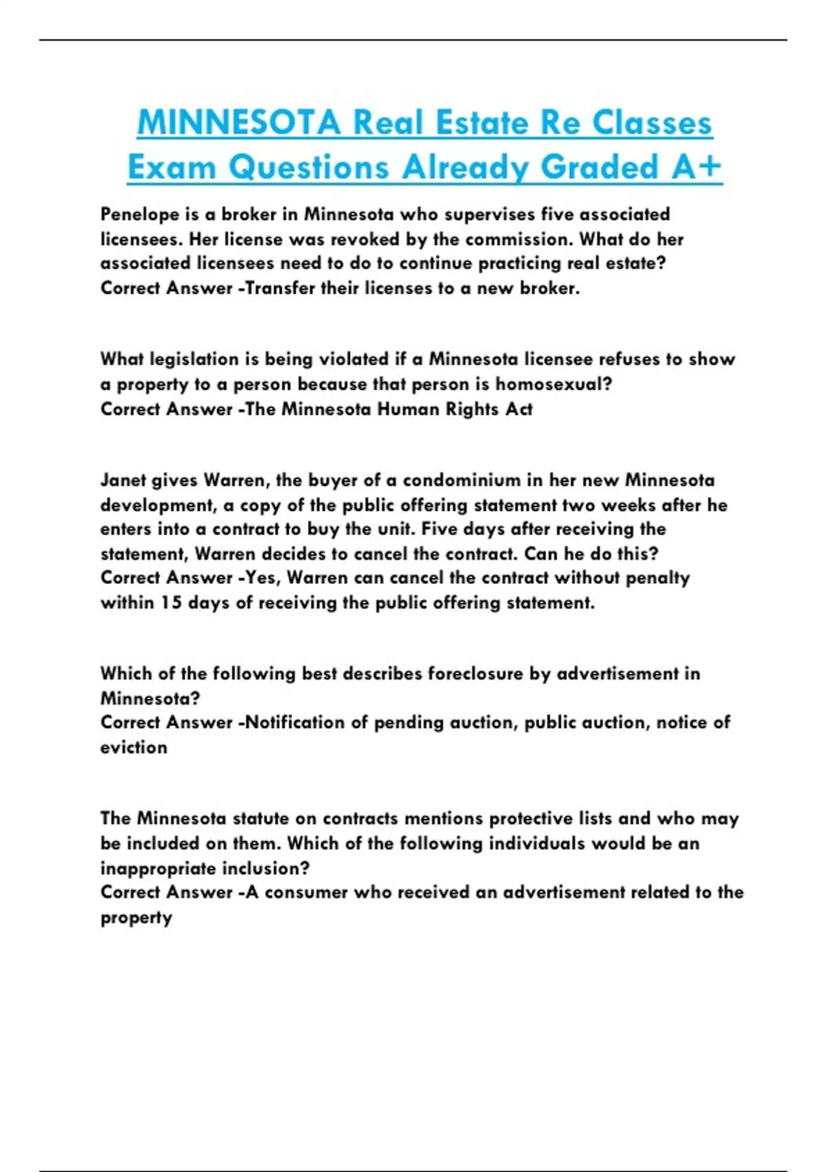 MINNESOTA Real Estate Re Classes Exam Questions Already Graded A+