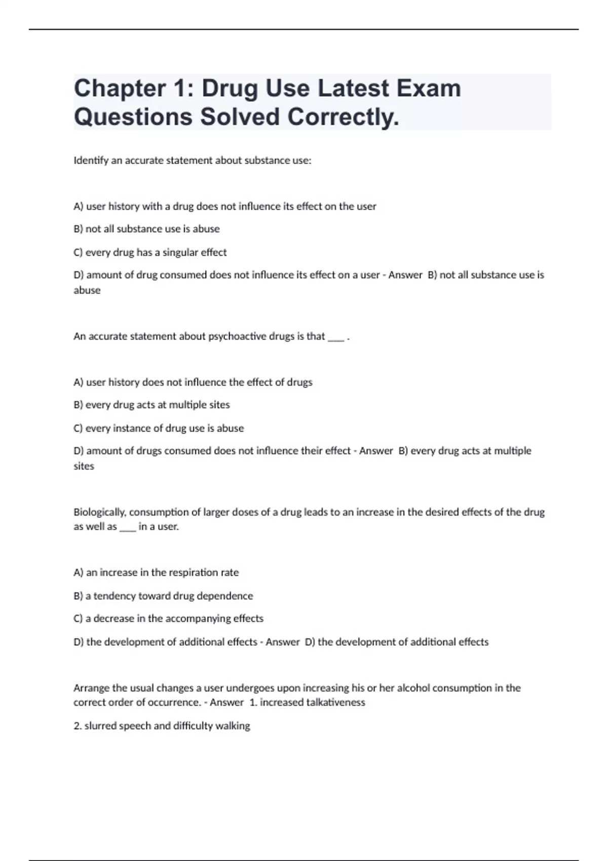 Identify an accurate statement about substance use: A) user history with a drug does not influence its effect on the user B) not all substance use is abuse C) every drug has a singular effect D) amount of drug consumed does not influence its effect on a user - Answer B) not all substance use is abuse An accurate statement about psychoactive drugs is that ___ . A) user history does not influence the effect of drugs B) every drug acts at multiple sites C) every instance of drug use is abuse D) amount of drugs consumed does not influence their effect - Answer B) every drug acts at multiple sites Biologically, consumption of larger doses of a drug leads to an increase in the desired effects of the drug as well as ___ in a user. A) an increase in the respiration rate B) a tendency toward drug dependence C) a decrease in the accompanying effects D) the development of additional effects - Answer D) the development of additional effects Arrange the usual changes a user undergoes upon increasing his or her alcohol consumption in the correct order of occurrence. - Answer 1. increased talkativeness 2. slurred speech and difficulty walking