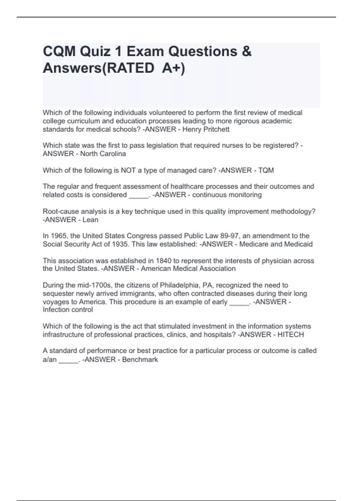 Which of the following individuals volunteered to perform the first review of medical college curriculum and education processes leading to more rigorous academic standards for medical schools? -ANSWER - Henry Pritchett Which state was the first to pass legislation that required nurses to be registered? -ANSWER - North Carolina Which of the following is NOT a type of managed care? -ANSWER - TQM The regular and frequent assessment of healthcare processes and their outcomes and related costs is considered _____. -ANSWER - continuous monitoring Root-cause analysis is a key technique used in this quality improvement methodology? -ANSWER - Lean In 1965, the United States Congress passed Public Law 89-97, an amendment to the Social Security Act of 1935. This law established: -ANSWER - Medicare and Medicaid This association was established in 1840 to represent the interests of physician across the United States. -ANSWER - American Medical Association During the mid-1700s, the citizens of Philadelphia, PA, recognized the need to sequester newly arrived immigrants, who often contracted diseases during their long voyages to America. This procedure is an example of early _____. -ANSWER - Infection control Which of the following is the act that stimulated investment in the information systems infrastructure of professional practices, clinics, and hospitals? -ANSWER - HITECH A standard of performance or best practice for a particular process or outcome is called a/an _____. -ANSWER - Benchmark