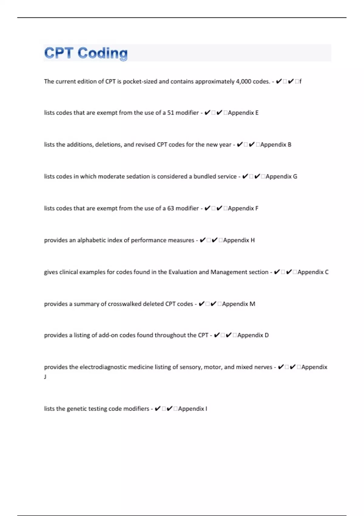 The current edition of CPT is pocket-sized and contains approximately 4,000 codes. - ️️f lists codes that are exempt from the use of a 51 modifier - ️️Appendix E lists the additions, deletions, and revised CPT codes for the new year - ️️Appendix B lists codes in which moderate sedation is considered a bundled service - ️️Appendix G lists codes that are exempt from the use of a 63 modifier - ️️Appendix F provides an alphabetic index of performance measures - ️️Appendix H gives clinical examples for codes found in the Evaluation and Management section - ️️Appendix C provides a summary of crosswalked deleted CPT codes - ️️Appendix M provides a listing of add-on codes found throughout the CPT - ️️Appendix D provides the electrodiagnostic medicine listing of sensory, motor, and mixed nerves - ️️Appendix J lists the genetic testing code modifiers - ️️Appendix I