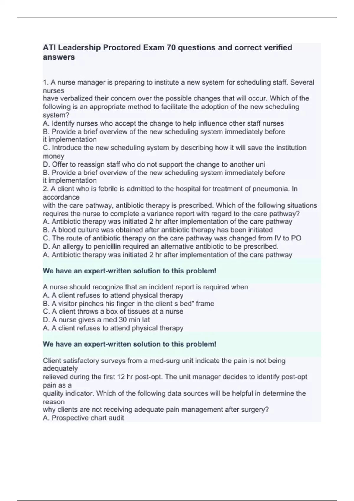 ATI Leadership Proctored Exam 70 questions and correct verified answersATI Leadership Proctored Exam 70 questions and correct verified answersATI Leadership Proctored Exam 70 questions and correct verified answers