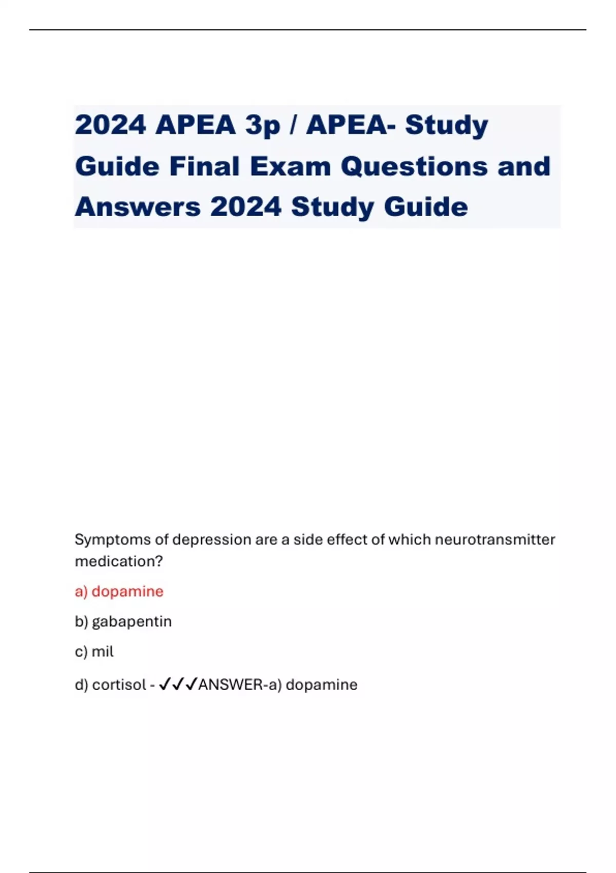2024 APEA 3p / APEA- Study Guide Final Exam Questions and Answers 2024 Study Guide Symptoms of depression are a side effect of which neurotransmitter medication? a) dopamine b) gabapentin c) mil d) cortisol - ANSWER-a) dopamine Symptoms of heartburn and regurgitation are associated with: a) Hiatal hernia b) Gastroesophageal reflux c) Peptic ulcer disease d) Esophageal cancer - ANSWER-b) Gastroesophageal reflux A 70 years old man walks 20 minutes most days of the week. He has begun to complain of pain of his left calf when he is walking. The problem has gotten gradually worse and now he is unable to complete his 20 minutes walks without stopping to rest. What choice best describes the pain associated with peripheral artery disease? a) A sharp, stabbing pain b) A dull pain and cramp c) An electric shock d) A pulsating pain - ANSWER-b) Adullpainandcramp Which lesion is dark raised and asymmetric with irregular border? a) Nevus b) Actinickeratosis c) Keratoacanthoma d) Melanoma - ANSWER-d) Melanoma A 32 years old woman presents with dull puffiness of the ayes pronounced not pitting periorbital edema this finding is suggestive of this condition? a) Nephrotic syndrome b) Myxedema c) Cushing syndrome d) Sinusitis - ANSWER-b) Myxedema 6. A 42 years old woman with a past medical history of migraine headaches is requesting prophylactic medication treatment. Which medication should the Nurse practitioner prescribe? a) Sumatriptan (Imitrex) b) Amitriptyline(Elavil) c) Verapamil (verelan)d) d)Metoprolol (Lopressor) - ANSWER-b) Amitriptyline(Elavil) A pediatric patient has areas of scaling on the scalp with round patches of alopecia. This clinical finding is consistent with: a) Tinea capitis b) Seborrheicdermatitis c) Trichotillomania d) Alopeciaareata - ANSWER-a) Tinea capitis