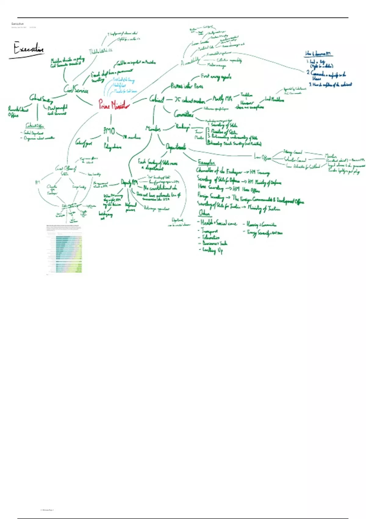 A mindmap that shows the detailed functions of the UK Executive branch. Relatively detailed. Includes notes about the Cabinet, functions of government departments and the civil service.