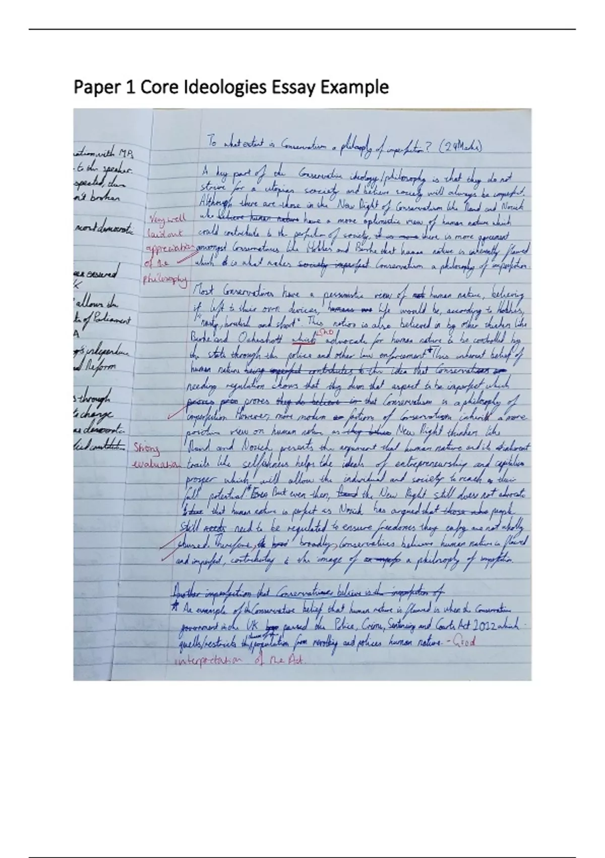 Question: To what extent is Conservatism a philosophy of imperfection Handwritten essay done under timed conditions. Marked by a teacher with feedback on how to make it better. Good essay to take inspiration from. As it is a holistic question, the essay itself covers large parts of conservatism.
