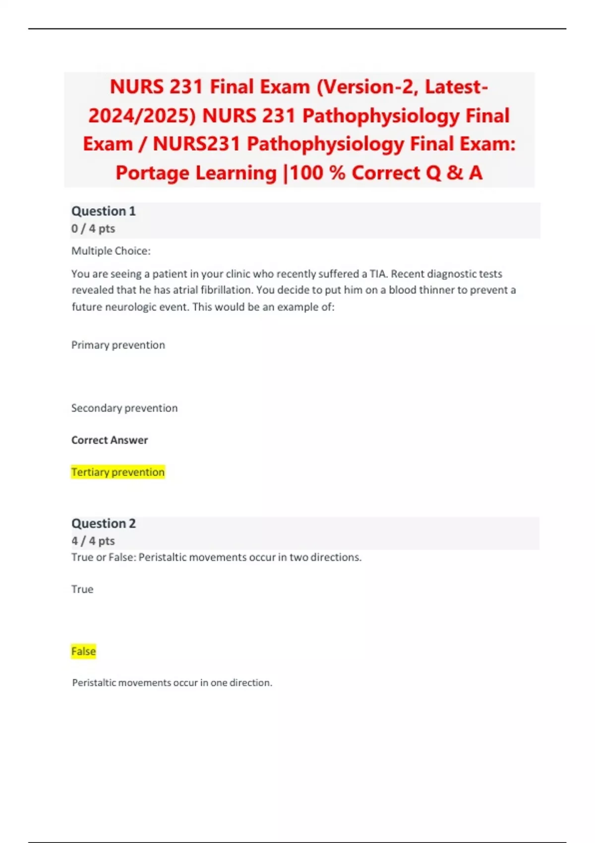 Multiple Choice: You are seeing a patient in your clinic who recently suffered a TIA. Recent diagnostic tests revealed that he has atrial fibrillation. You decide to put him on a blood thinner to prevent a future neurologic event. This would be an example of: Primary prevention Secondary prevention Correct Answer Tertiary prevention True or False: Peristaltic movements occur in two directions. True False Peristaltic movements occur in one direction. NURS 231 Final Exam (Version -2, Latest - 2024/2025) NURS 231 Pathophysiology Final Exam / NURS231 Pathophysiology Final Exam: Portage Learning |100 % Correct Q & A Question 1 pts Question 2 pts You are reading results from a recent blood panel for Susan, a 48-year -old female. Her hemoglobin levels are 7 g/dL. Would this be considered a normal or abnormal value? Your Answer: Normal Abnormal. Normal Hemoglobin levels for a female is 12-15 g/dL. Multiple Choice: Which of the following is synthesized in the kidney and regulates the differentiation of red blood cells within bone marrow? 25-hydroxycholecalciferol Erythropoietin cholecalciferol True or False. If false, explain why the statement is false. A malignant neoplasm resembles the cells of the tissues of origin and possesses a slow rate of growth. Your Answer: False. Malignant neoplasm resemblance will differ from tissues of origin False. A benign neoplasm resembles the cells of the tissues of origin and possesses a slow rate of growth. OR Question 3 Not yet graded / 4 pts Question 4 pts Question 5 Not yet graded / 4 pts A malignant neoplasm invades and destroys tissue and possesses a rapid rate of growth. You are talking to your patient who has been recently diagnosed with Osteoporosis. You have suggested that they start taking Calcium and Vitamin D daily. What else can you recommend to slow the progression of this disease? Your Answer: Include a more active lifestyle such as walking You should recommend regular weight -bearing exercises to increase bone density. This should be done in a safe manner minimizing the risk for falls. (The key is safety. Weight -bearing exercises done safely is the best answer, but exercise done in a way that minimizes risk of fractures is the key. Exercises done safely as an answer should receive full credit.) You are working in the Emergency Department, and a 17-year -old male who is 6’2” is brought in via ambulance with complaints of chest pain on the left side and difficulty breathing. His parents report that he was playing basketball in their driveway and suddenly collapsed with complaints of the above symptoms. You order a CT scan of his chest and determine that he has experienced a large, spontaneous pneumothorax in his left lung. Describe the treatment required for this condition. Your Answer: A spontaneous pneumothorax can be relieved with supplemental oxygen. In extreme cases, an invasive procedure may be needed to relieve fluid from the lungs. In a large pneumothorax, the air must be removed by needle aspiration or a closed drainage system with or without suction. True or False. If false, explain why it is false. Humoral immunity is a form of innate immunity. Your Answer: True False, humoral immunity is a form of adaptive immunity. Question 6 Not yet graded / 4 pts Question 7 Not yet graded / 4 pts Question 8 Not yet graded / 4 pts (If False is correctly answered, 3 points should be awarded. Full credit (4 points) should be awarded if False is answered and the statement is corrected properly.) Which of the following would you expect to find if someone has Addison’s Disease? Select all that apply. Correct Answer Decreased cortisol levels Increased cortisol levels Hyperpigmentation of the skin A buffalo hump Multiple Choice: What type of signaling depends on hormones carried in the bloodstream to act on cells throughout the body? Autocrine Endocrine Question 9 pts Question 10 pts