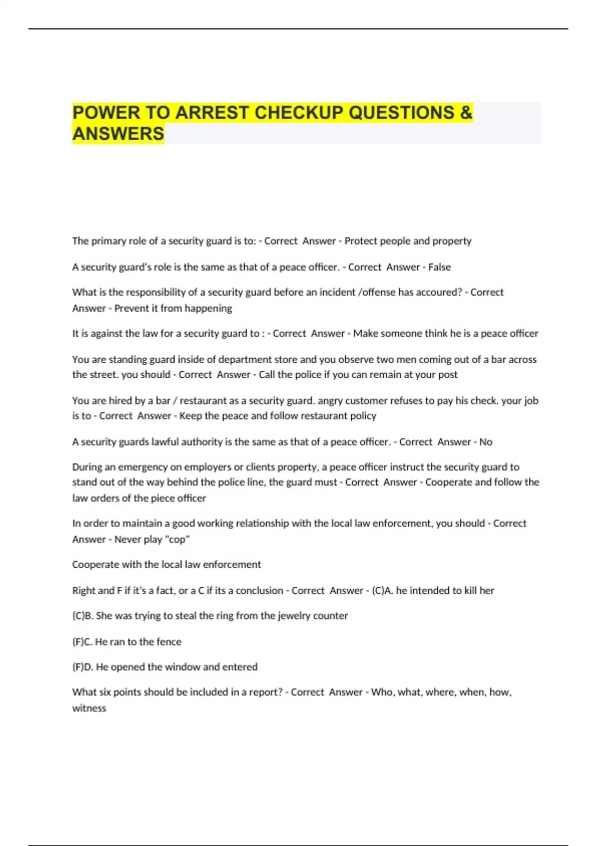 POWER TO ARREST CHECKUP QUESTIONS & ANSWERS