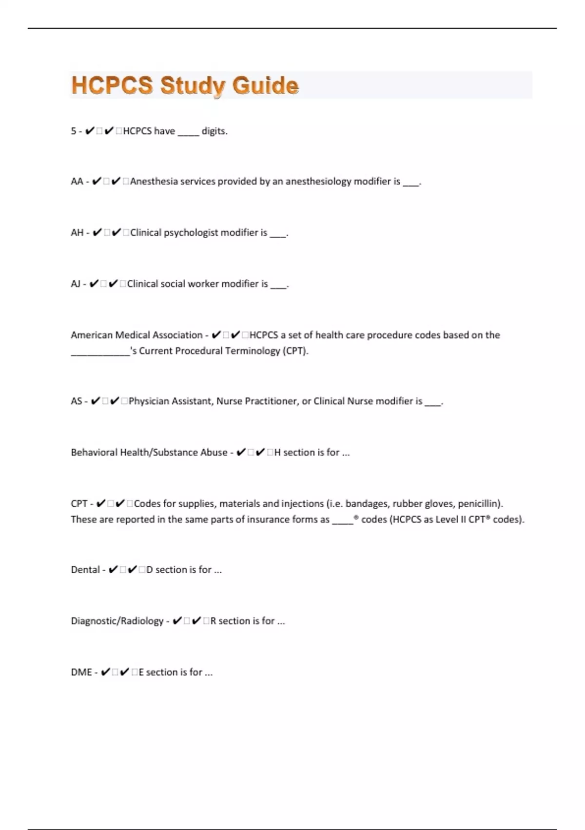5 - ️️HCPCS have ____ digits. AA - ️️Anesthesia services provided by an anesthesiology modifier is ___. AH - ️️Clinical psychologist modifier is ___. AJ - ️️Clinical social worker modifier is ___. American Medical Association - ️️HCPCS a set of health care procedure codes based on the ___________'s Current Procedural Terminology (CPT). AS - ️️Physician Assistant, Nurse Practitioner, or Clinical Nurse modifier is ___. Behavioral Health/Substance Abuse - ️️H section is for ... CPT - ️️Codes for supplies, materials and injections (i.e. bandages, rubber gloves, penicillin). These are reported in the same parts of insurance forms as ____® codes (HCPCS as Level II CPT® codes). Dental - ️️D section is for ... Diagnostic/Radiology - ️️R section is for ... DME - ️️E section is for ...