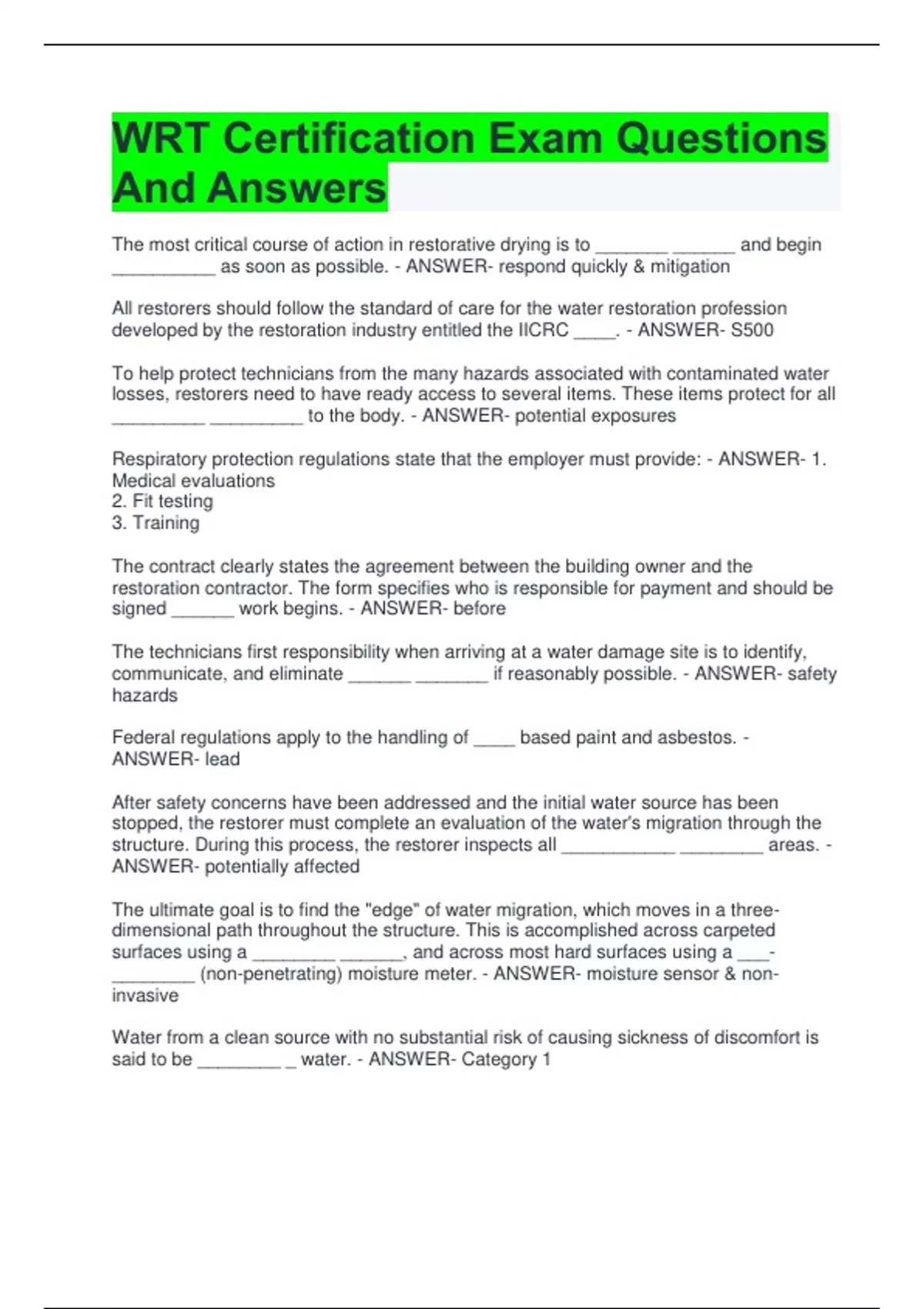 WRT Certification Exam Questions And Answers The most critical course of action in restorative drying is to _______ ______ and begin __________ as soon as possible. - ANSWER- respond quickly & mitigation All restorers should follow the standard of care for the water restoration profession developed by the restoration industry entitled the IICRC ____. - ANSWER- S500 To help protect technicians from the many hazards associated with contaminated water losses, restorers need to have ready access to several items. These items protect for all _________ _________ to the body. - ANSWER- potential exposures Respiratory protection regulations state that the employer must provide: - ANSWER- 1. Medical evaluations 2. Fit testing 3. Training The contract clearly states the agreement between the building owner and the restoration contractor. The form specifies who is responsible for payment and should be signed ______ work begins. - ANSWER- before The technicians first responsibility when arriving at a water damage site is to identify, communicate, and eliminate ______ _______ if reasonably possible. - ANSWER- safety hazards Federal regulations apply to the handling of ____ based paint and asbestos. - ANSWER- lead After safety concerns have been addressed and the initial water source has been stopped, the restorer must complete an evaluation of the water's migration through the structure. During this process, the restorer inspects all ___________ ________ areas. - ANSWER- potentially affected The ultimate goal is to find the "edge" of water migration, which moves in a three-dimensional path throughout the structure. This is accomplished across carpeted surfaces using a ________ ______, and across most hard surfaces using a ___-________ (non-penetrating) moisture meter. - ANSWER- moisture sensor & non-invasive Water from a clean source with no substantial risk of causing sickness of discomfort is said to be ________ _ water. - ANSWER- Category 1 Water that has a significant degree of chemical, biological, and/or physical contamination and a potential to cause sickness or discomfort is ________ _. - ANSWER- Category 2 Cleaning procedures must be employed before the drying of a Category 2 water loss can continue. At a minimum, affected ______ ________ (or pad) must be removed and disposed of, and carpet must be throughly cleaned using hot water extraction method. - ANSWER- carpet underlay
