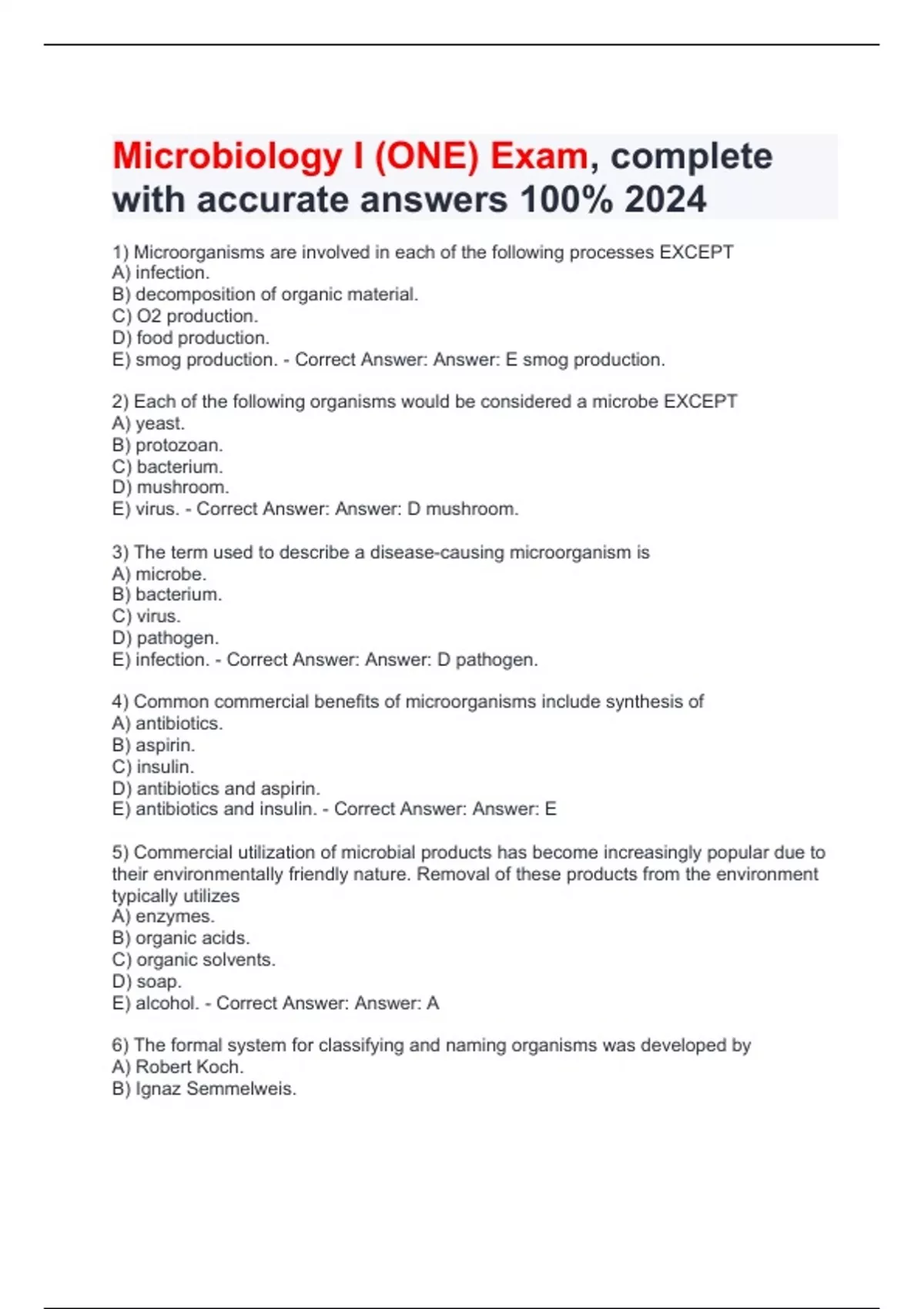 Microbiology I (ONE) Exam, complete with accurate answers 100% 2024 1) Microorganisms are involved in each of the following processes EXCEPT A) infection. B) decomposition of organic material. C) O2 production. D) food production. E) smog production. - Correct Answer: Answer: E smog production. 2) Each of the following organisms would be considered a microbe EXCEPT A) yeast. B) protozoan. C) bacterium. D) mushroom. E) virus. - Correct Answer: Answer: D mushroom. 3) The term used to describe a disease-causing microorganism is A) microbe. B) bacterium. C) virus. D) pathogen. E) infection. - Correct Answer: Answer: D pathogen. 4) Common commercial benefits of microorganisms include synthesis of A) antibiotics. B) aspirin. C) insulin. D) antibiotics and aspirin. E) antibiotics and insulin. - Correct Answer: Answer: E 5) Commercial utilization of microbial products has become increasingly popular due to their environmentally friendly nature. Removal of these products from the environment typically utilizes A) enzymes. B) organic acids. C) organic solvents. D) soap. E) alcohol. - Correct Answer: Answer: A 6) The formal system for classifying and naming organisms was developed by A) Robert Koch. B) Ignaz Semmelweis.