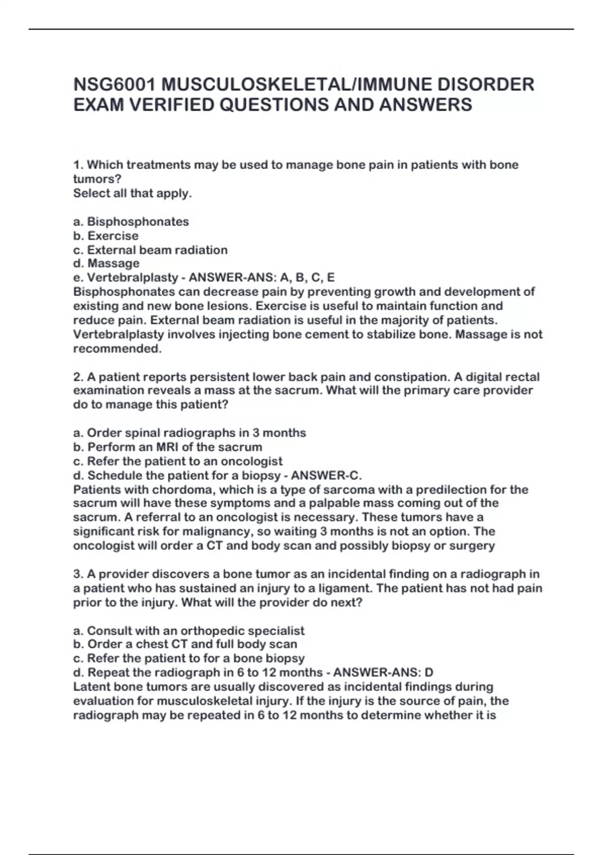 NSG6001 MUSCULOSKELETAL/IMMUNE DISORDER EXAM VERIFIED QUESTIONS AND ANSWERS 1. Which treatments may be used to manage bone pain in patients with bone tumors? Select all that apply. a. Bisphosphonates b. Exercise c. External beam radiation d. Massage e. Vertebralplasty - ANSWER-ANS: A, B, C, E Bisphosphonates can decrease pain by preventing growth and development of existing and new bone lesions. Exercise is useful to maintain function and reduce pain. External beam radiation is useful in the majority of patients. Vertebralplasty involves injecting bone cement to stabilize bone. Massage is not recommended. 2. A patient reports persistent lower back pain and constipation. A digital rectal examination reveals a mass at the sacrum. What will the primary care provider do to manage this patient? a. Order spinal radiographs in 3 months b. Perform an MRI of the sacrum c. Refer the patient to an oncologist d. Schedule the patient for a biopsy - ANSWER-C. Patients with chordoma, which is a type of sarcoma with a predilection for the sacrum will have these symptoms and a palpable mass coming out of the sacrum. A referral to an oncologist is necessary. These tumors have a significant risk for malignancy, so waiting 3 months is not an option. The oncologist will order a CT and body scan and possibly biopsy or surgery 3. A provider discovers a bone tumor as an incidental finding on a radiograph in a patient who has sustained an injury to a ligament. The patient has not had pain prior to the injury. What will the provider do next? a. Consult with an orthopedic specialist b. Order a chest CT and full body scan c. Refer the patient to for a bone biopsy d. Repeat the radiograph in 6 to 12 months - ANSWER-ANS: D Latent bone tumors are usually discovered as incidental findings during evaluation for musculoskeletal injury. If the injury is the source of pain, the radiograph may be repeated in 6 to 12 months to determine whether it is increasing in size. Consultation with an orthopedic specialist, referral for a biopsy, and further testing with chest CT or full body scanning are done if there is suspicion of an active tumor 4. A patient with shoulder pain is seen by an orthopedic specialist who notes erythema, warmth, and fluctuance of the shoulder joint. What is the next step in treatment for this patient? a. Admit to the hospital for intravenous antibiotics b. Inject lidocaine into the joint and reassess in 5 to 10 minutes c. Order a plain radiograph of the shoulder to identify possible fracture d. Perform a shoulder ultrasound to further evaluate the cause - ANSWER-ANS: A Immediate referral is indicated for patients who present with symptoms consistent with septic bursitis, such as with the symptoms above. Lidocaine is injected into a painful joint to evaluate for improvement to determine whether bursitis or tendonitis is present as a result of impingement. This exam is not consistent with fracture. An ultrasound is not indicated.REF: Shoulder Bursitis/Management 5. A patient has pain on the plantar aspect of the heel with weight bearing after rest. The pain is worsened with dorsiflexion of the foot. What is the initial treatment for this patient? a. A series of steroid injections b. Avoiding all high-impact activities c. Night splints d. Wearing flat shoes only - ANSWER-ANS: B This patient has signs of plantar fasciitis. The initial treatment includes avoiding all high-impact activities. A single steroid injection may be given with subsequent injections if no improvement. Night splints are part of second-tier treatment. Flat shoes should be avoided.REF: Plantar Fasciitis/Management