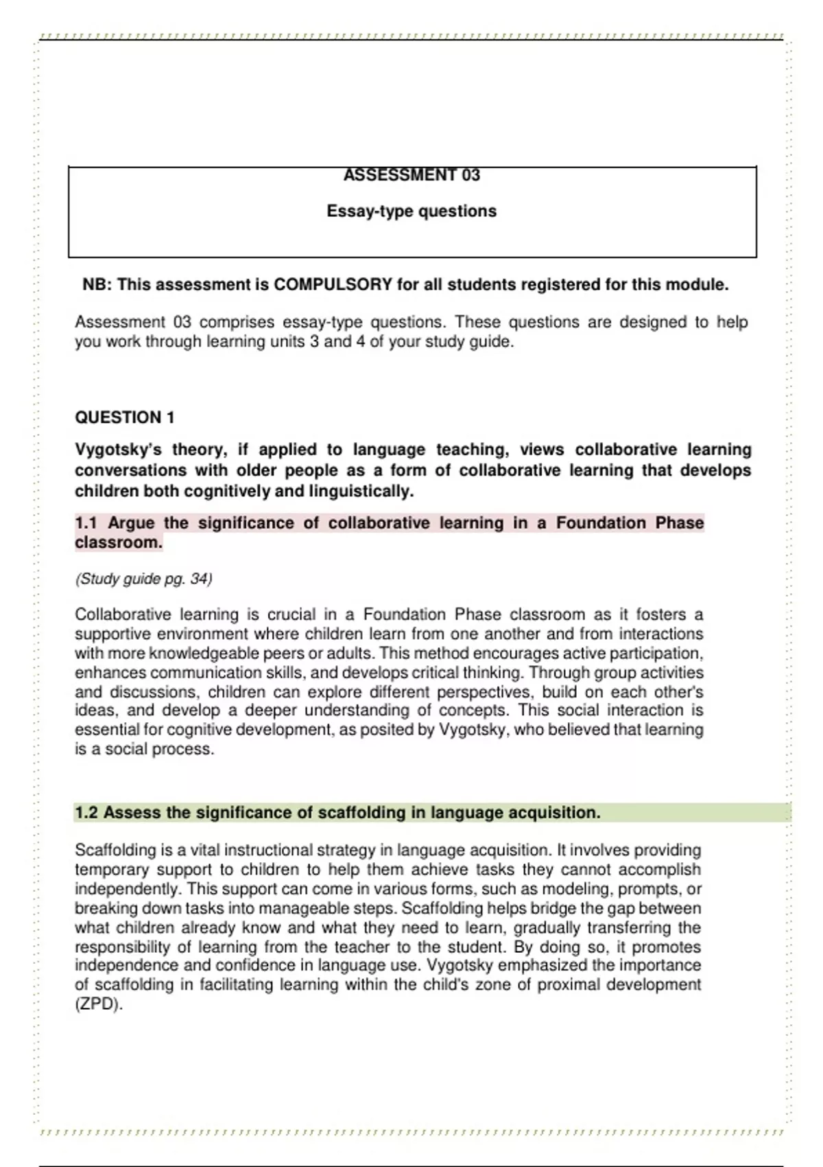 Assessment 03 comprises essay-type questions. These questions are designed to help