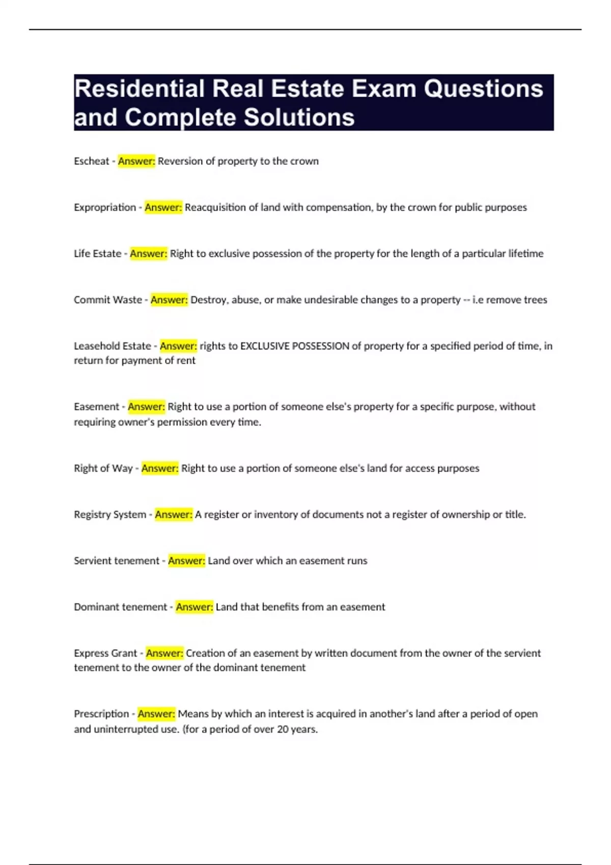 Residential Real Estate Exam Questions and Complete Solutions