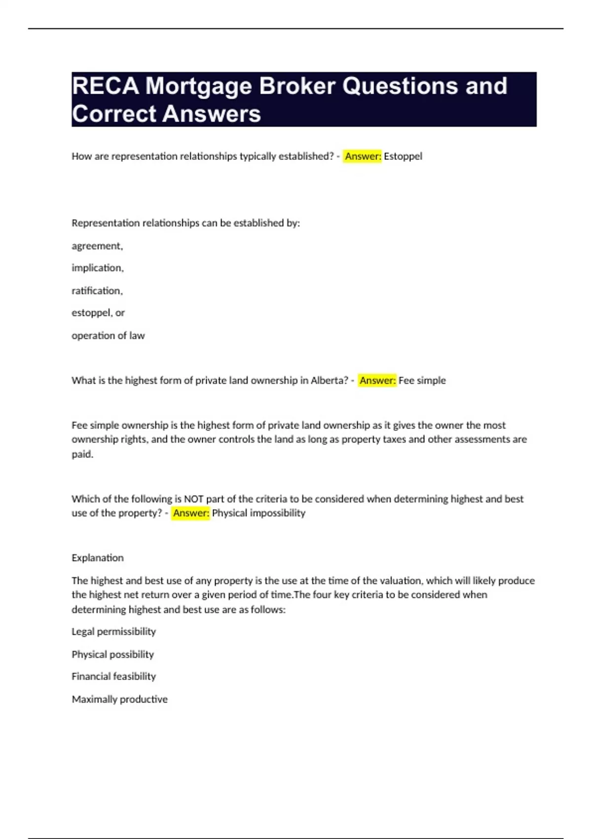 RECA Mortgage Broker Questions and Correct Answers.