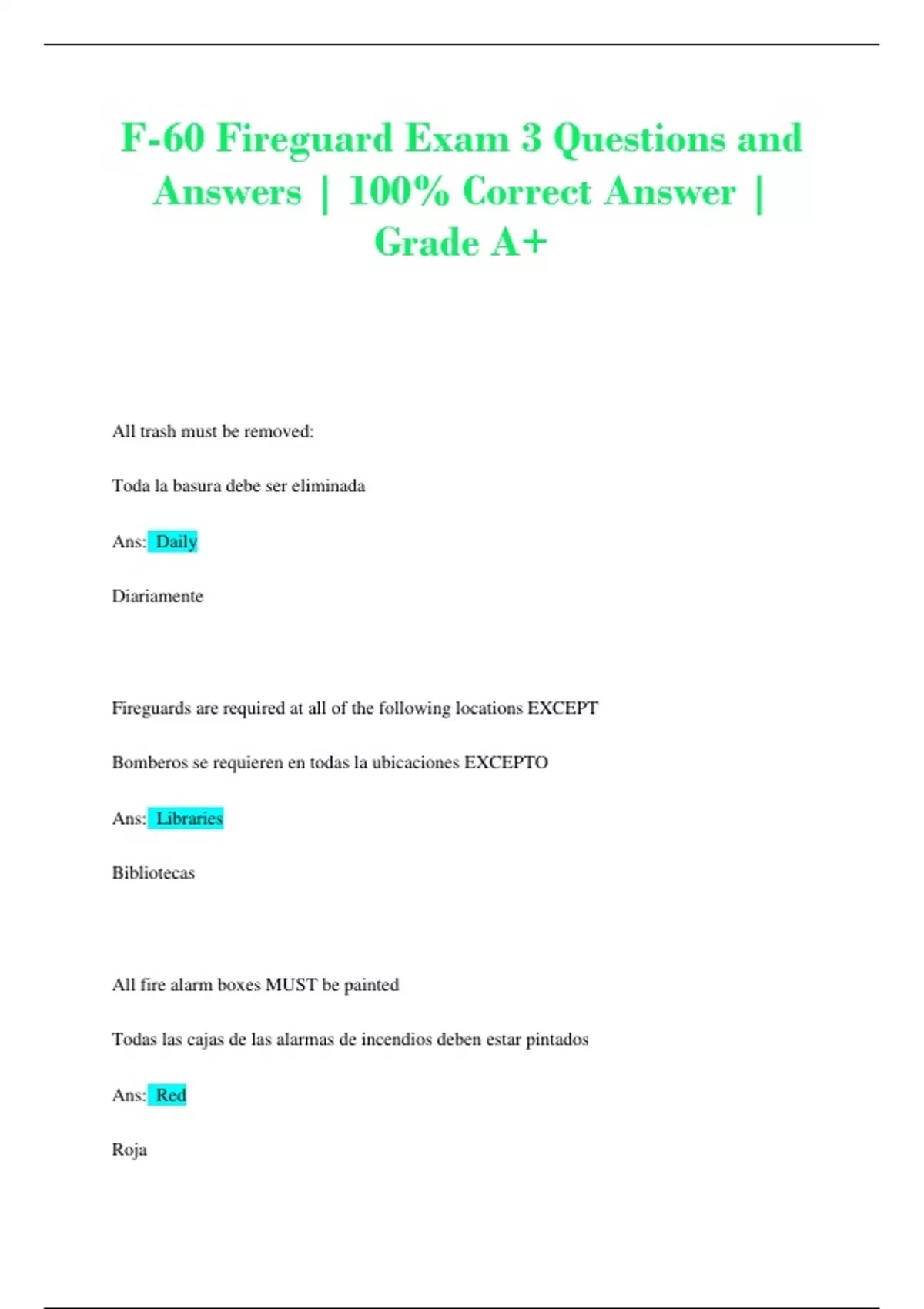 All trash must be removed: Toda la basura debe ser eliminada Ans: Daily Diariamente Fireguards are required at all of the following locations EXCEPT Bomberos se requieren en todas la ubicaciones EXCEPTO Ans: Libraries Bibliotecas All fire alarm boxes MUST be painted Todas las cajas de las alarmas de incendios deben estar pintados Ans: Red Roja The MINIMUM number of fire alarm boxes required on each floor of a building is El numero minimo de cajas de incendios requerida en cada piso de un edifico son Ans: 1 1 Interior fire alarm boxes are located at the Cajas de alarmas de incendios están localizadas en Ans: Exits from the floor Salidas de cada piso