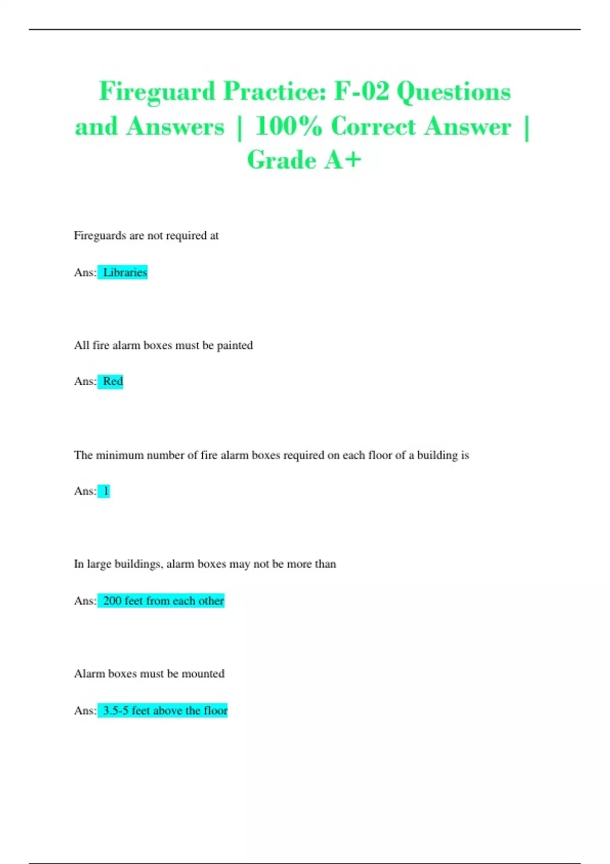 Fireguard Practice: F -02 Questions and Answers | 100% Correct Answer | Grade A+ Fireguards are not required at Ans: Libraries All fire alarm boxes must be painted Ans: Red The minimum number of fire alarm boxes required on each floor of a building is Ans: 1 In large buildings, alarm boxes may not be more than Ans: 200 feet from each other Alarm boxes must be mounted Ans: 3.5-5 feet above the floor In an emergency, a fireguard's most effective quality is their Ans: Composure In a fire emergency, the fire department may be notified by Ans: Telephone, Radio, an d exterior alarm box An exit aisle at least Ans: 3 feet wide is required at all locations Areas that must not be obstructed include Ans: Hallways, Stairways, Exits Non-emergency windows can be obstructed Ans: True Buildings must be checked Ans: Daily for potential fire hazards Fire Alarm Boxes Must Be Checked Ans: Daily