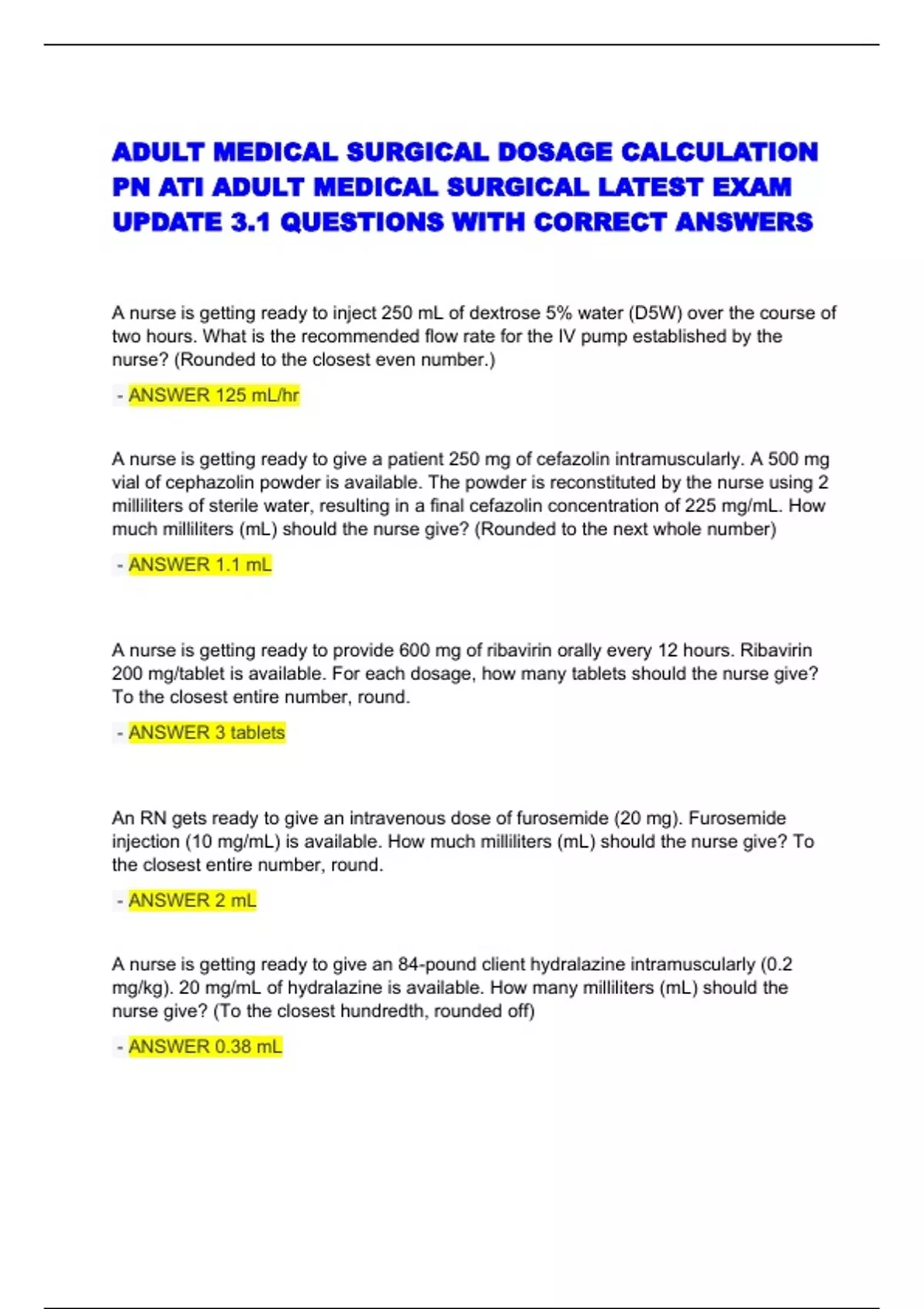 ADULT MEDICAL SURGICAL DOSAGE CALCULATION PN ATI ADULT MEDICAL SURGICAL LATEST EXAM UPDATE 3.1 QUESTIONS WITH CORRECT ANSWERS