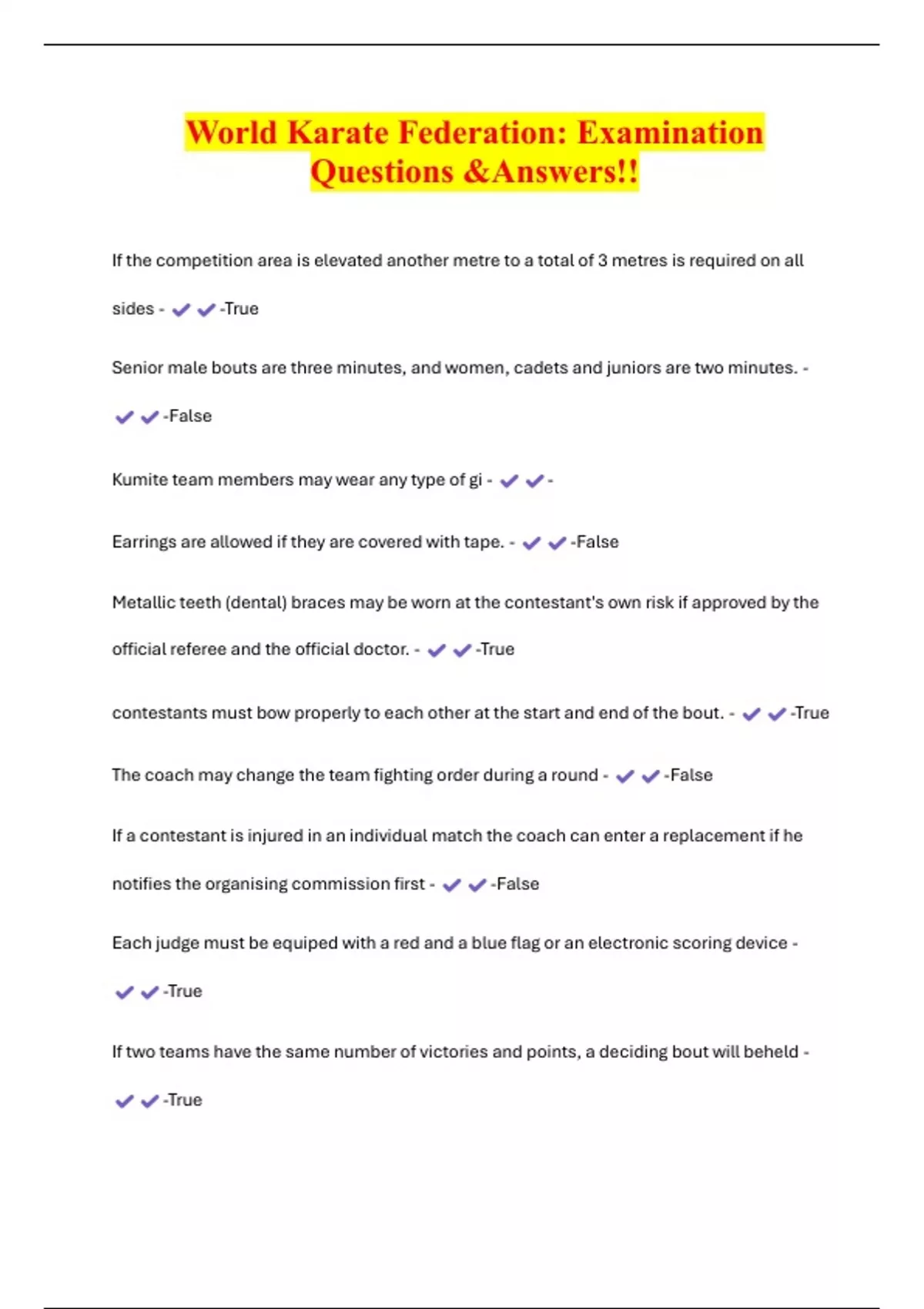 World Karate Federation: Examination Questions &Answers!! If the competition area is elevated another metre to a total of 3 metres is required on all sides - -True Senior male bouts are three minutes, and women, cadets and juniors are two minutes. - -False Kumite team members may wear any type of gi - - Earrings are allowed if they are covered with tape. - -False Metallic teeth (dental) braces may be worn at the contestant's own risk if approved by the official referee and the official doctor. - -True contestants must bow properly to each other at the start and end of the bout. - -True The coach may change the team fighting order during a round - -False If a contestant is injured in an individual match the coach can enter a replacement if he notifies the organising commission first - -False Each judge must be equiped with a red and a blue flag or an electronic scoring device - -True If two teams have the same number of