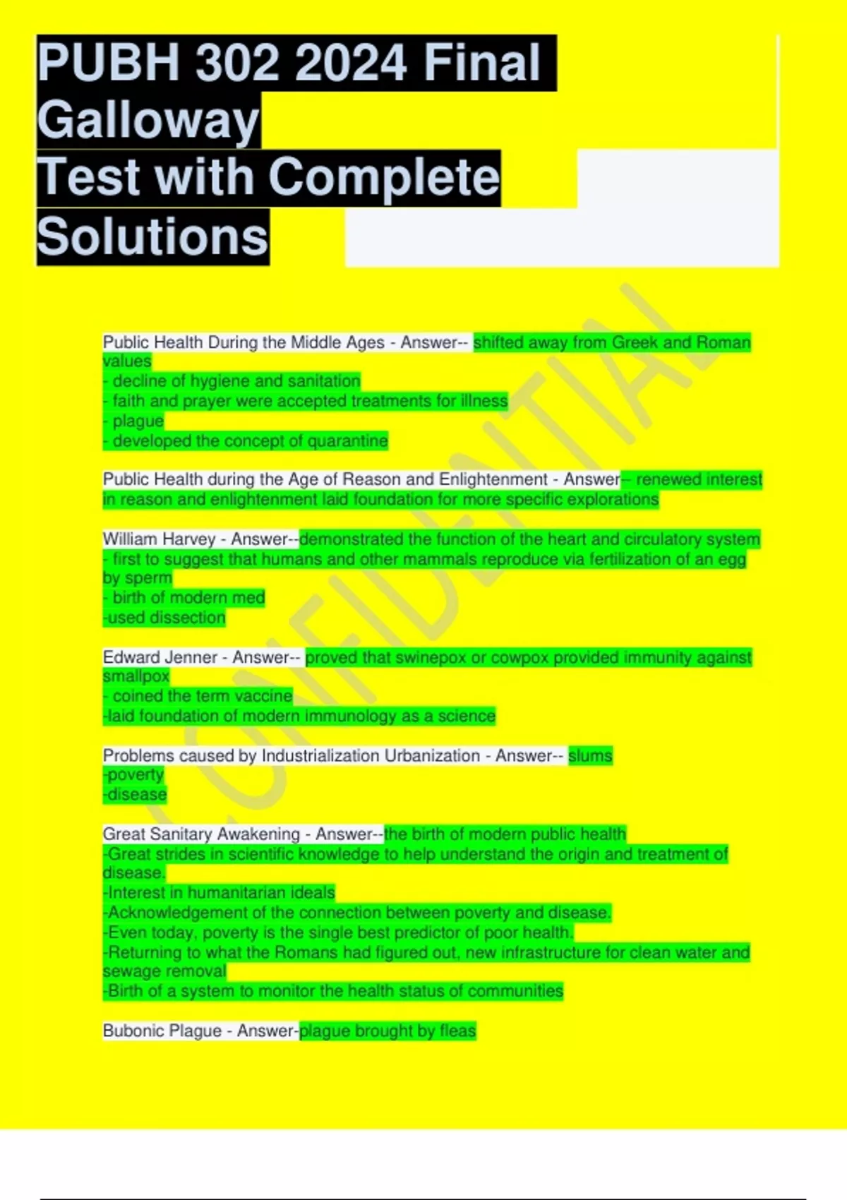 PUBH 302 Final Galloway Test with Complete Solutions Public Health During the Middle Ages - Answer-- shifted away from Greek and Roman values - decline of hygiene and sanitation - faith and prayer were accepted treatments for illness - plague - developed the concept of quarantine Public Health during the Age of Reason and Enlightenment - Answer-- renewed interest in reason and enlightenment laid foundation for more specific explorations William Harvey - Answer--demonstrated the function of the heart and circulatory system - first to suggest that humans and other mammals reproduce via fertilization of an egg by sperm - birth of modern med -used dissection Edward Jenner - Answer-- proved that swinepox or cowpox provided immunity against smallpox - coined the term vaccine -laid foundation of modern immunology as a science Problems caused by Industrialization Urbanization - Answer-- slums -poverty -disease Great Sanitary Awakening - Answer--the birth of modern public health -Great strides in scientific knowledge to help understand the origin and treatment of disease. -Interest in humanitarian ideals -Acknowledgement of the connection between poverty and disease. -Even today, poverty is the single best predictor of poor health. -Returning to what the Romans had figured out, new infrastructure for clean water and sewage removal -Birth of a system to monitor the health status of communities Bubonic Plague - Answer-plague brought by fleas pneumonic plague - Answer-plague spread by sneezing, fever was more contagious bc it was spread airborne Four Phases of the Development of modern-day public health described by Ashton - Answer-1) an initial environmentally-focused phase which addresses infectious diseases related to "urbanization, poverty, and squalor" 2) second phase of personal preventive medical services related to immunization, family hygiene, health education, and family planning which began with the development of vaccines 3) third, therapeutic era that began with the development of insulin and antibiotics. 4) A recognition that the 'environment' is also social, economic and psychological and that 'healthy public policy' (Hancock, 1982) is an appropriate part of this new public health. Dr. John Snow - Answer-- became concerned of the cholera outbreaks in London - made careful observations about the disease and who caught it - used a "ghost map" to trace all the deaths and was able to detect the pump that was causing the illness - removed the handle off the broad street pump and the illness subsided -using epidemiological practices, he identified and stopped the outbreak and source of cholera England Sanitary Reform - Answer-- Chadwick Report "Survey into the Sanitary Condition of the Labouring Classes in Great Britain - graphic descriptions of filth and disease spread in urban areas - reforms in sanitation, health care and treatment of poor working classes - first modern sanitation legislation was enacted in 1837 Lemuel Shattuck - Answer--Developed the original plan that led to the establishment in 1869 of the nation's first Board of Health in Massachusetts Louis Pastuer - Answer-proposed the germ theory of disease, which which was crucial to the development of modern scientific medical practices Robert Koch - Answer-Developed the culture plate method to identify pathogens Sanitation Revolution - Answer-Clean water; water treatment Food inspection Soaps, disinfectants, and pharmaceuticals Personal hygiene (bathing) Public works departments; garbage collection, landfills, and street cleaning Public health departments and regulation