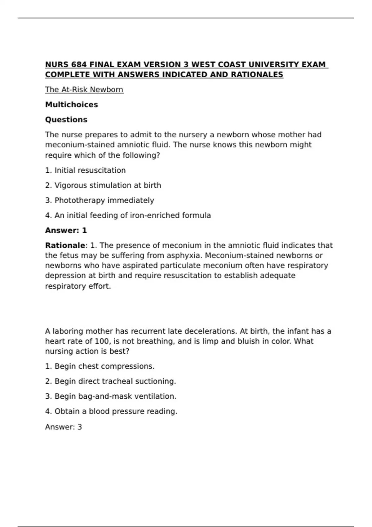 NURS 684 FINAL EXAM VERSION 3 WEST COAST UNIVERSITY EXAM COMPLETE WITH ANSWERS INDICATED AND RATIONALES The At-Risk Newborn Multichoices Questions The nurse prepares to admit to the nursery a newborn whose mother had meconium-stained amniotic fluid. The nurse knows this newborn might require which of the following? 1. Initial resuscitation 2. Vigorous stimulation at birth 3. Phototherapy immediately 4. An initial feeding of iron-enriched formula Answer: 1 Rationale: 1. The presence of meconium in the amniotic fluid indicates that the fetus may be suffering from asphyxia. Meconium-stained newborns or newborns who have aspirated particulate meconium often have respiratory depression at birth and require resuscitation to establish adequate respiratory effort. A laboring mother has recurrent late decelerations. At birth, the infant has a heart rate of 100, is not breathing, and is limp and bluish in color. What nursing action is best? 1. Begin chest compressions. 2. Begin direct tracheal suctioning. 3. Begin bag-and-mask ventilation. 4. Obtain a blood pressure reading. Answer: 3 Rationale: 3. Most newborns can be effectively resuscitated by bag-and-mask ventilation. Which fetal/neonatal risk factors would lead the nurse to anticipate a potential need to resuscitate a newborn? Note: Credit will be given only if all correct choices and no incorrect choices are selected. Select all that apply. 1. Nonreassuring fetal heart rate pattern/sustained bradycardia 2. Fetal scalp/capillary blood sample pH greater than 7.25 3. History of meconium in amniotic fluid 4. Prematurity 5. Significant intrapartum bleeding Answer: 1, 3, 4, 5 Rationale: 1. Nonreassuring fetal heart rate pattern/sustained bradycardia would be considered a potential need to resuscitate a newborn. 3. History of meconium in amniotic fluid would be considered a potential need to resuscitate a newborn. 4. Prematurity would be considered a potential need to resuscitate a newborn. 5. Significant intrapartum bleeding would be considered a potential need to resuscitate a newborn. Rationale.. During newborn resuscitation, how does the nurse evaluate the effectiveness of bag-and-mask ventilations? 1. The rise and fall of the chest 2. Sudden wakefulness 3. Urinary output 4. Adequate thermoregulation Answer: 1 Rationale: 1. With proper resuscitation, chest movement is observed for proper ventilation. Pressure should be adequate to move the chest wall. A nurse explains to new parents that their newborn has developed respiratory distress syndrome (RDS). Which of the following signs and symptoms would not be characteristic of RDS? 1. Grunting respirations 2. Nasal flaring 3. Respiratory rate of 40 during sleep 4. Chest retractions Answer: 3 Rationale: 3. A respiratory rate of 40 during sleep is normal. A client in labor is found to have meconium-stained amniotic fluid upon rupture of membranes. At delivery, the nurse finds the infant to have depressed respirations and a heart rate of 80. What does the nurse
