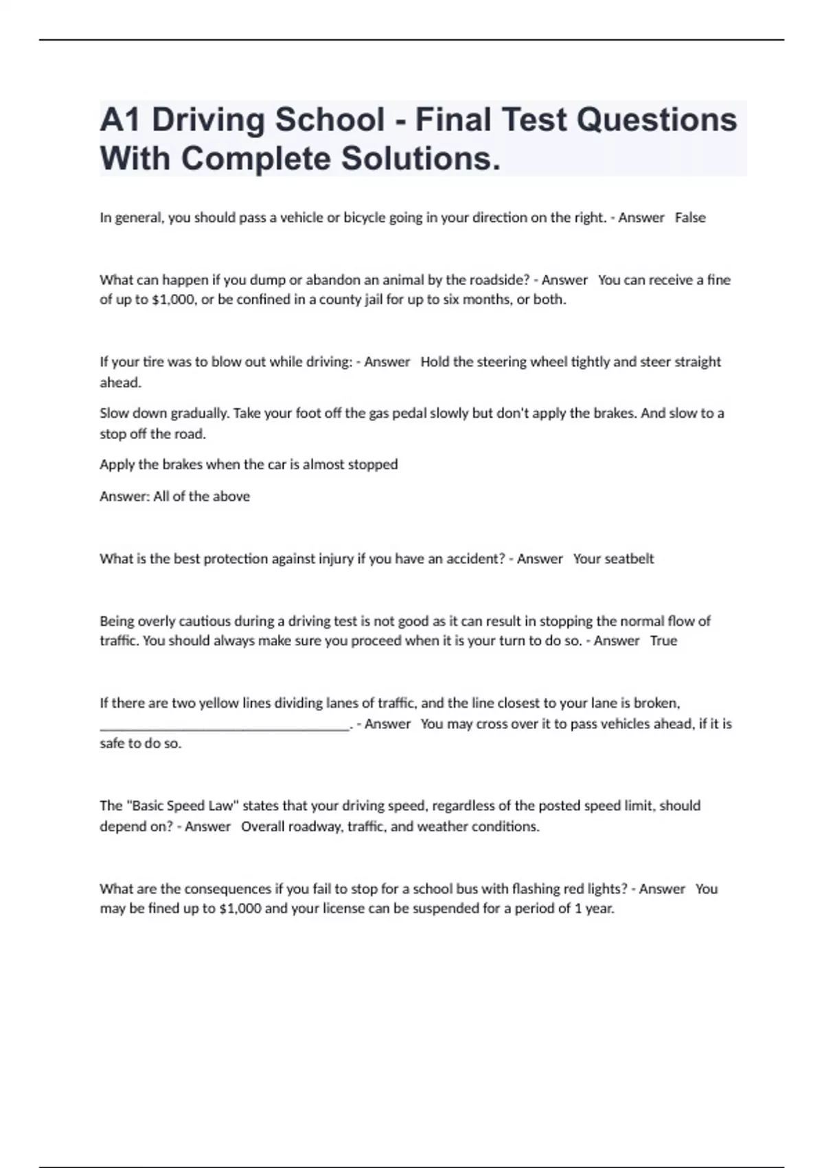 A1 Driving School - Final Test Questions With Complete Solutions.