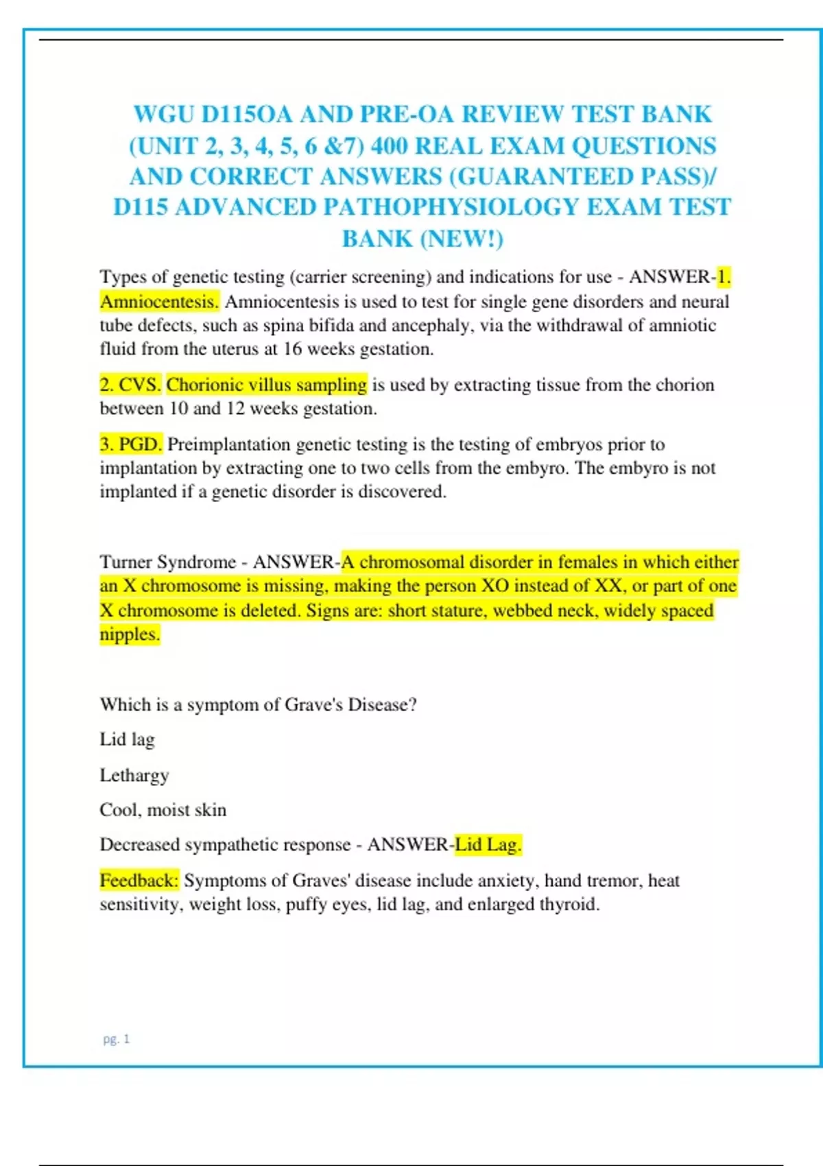 WGU D115 OA AND PRE-OA REVIEW TEST BANK (UNIT 2, 3, 4, 5, 6 &7) 400 REAL EXAM QUESTIONS AND CORRECT ANSWERS (GUARANTEED PASS)/ D115 ADVANCED PATHOPHYSIOLOGY EXAM TEST BANK (NEW!)
