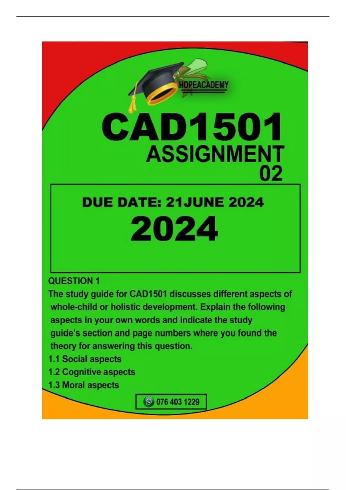 CAD 1501 ASSIGNMENT 2 DUE 21 JUNE 2024 QUESTION 1 The study guide for CAD1501 discusses different aspects of whole-child or holistic development. Explain the following aspects in your own words and indicate the study guide’s section and page numbers where you found the theory for answering this question. 1.1 Social aspects 1.2 Cognitive aspects 1.3 Moral aspects