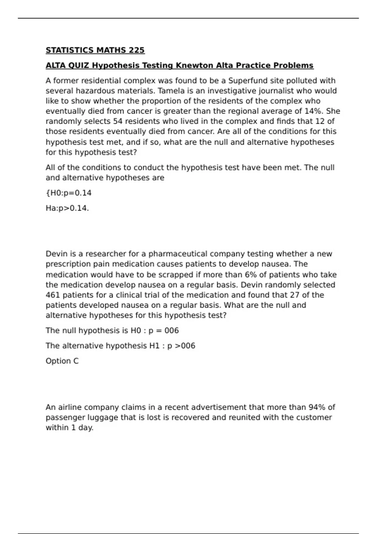 STATISTICS MATHS 225 ALTA QUIZ Hypothesis Testing Knewton Alta Practice Problems A former residential complex was found to be a Superfund site polluted with several hazardous materials. Tamela is an investigative journalist who would like to show whether the proportion of the residents of the complex who eventually died from cancer is greater than the regional average of 14%. She randomly selects 54 residents who lived in the complex and finds that 12 of those residents eventually died from cancer. Are all of the conditions for this hypothesis test met, and if so, what are the null and alternative hypotheses for this hypothesis test? All of the conditions to conduct the hypothesis test have been met. The null and alternative hypotheses are {H0:p=0.14 Ha:p>0.14. Devin is a researcher for a pharmaceutical company testing whether a new prescription pain medication causes patients to develop nausea. The medication would have to be scrapped if more than 6% of patients who take the medication develop nausea on a regular basis. Devin randomly selected 461 patients for a clinical trial of the medication and found that 27 of the patients developed nausea on a regular basis. What are the null and alternative hypotheses for this hypothesis test? The null hypothesis is H0 : p = 006 The alternative hypothesis H1 : p >006 Option C An airline company claims in a recent advertisement that more than 94% of passenger luggage that is lost is recovered and reunited with the customer within 1 day. Hunter is a graduate student studying statistics. For a research project, Hunter wants to find out whether there is convincing evidence in support of the airline company’s claim. He randomly selects 315 passengers of the airline whose luggage was lost by the airline and found that 276 of those passengers were reunited with their luggage within 1 day. Are all of the conditions for this hypothesis test met, and if so, what are the null and alternative hypotheses for this hypothesis test? All of the conditions to conduct the hypothesis test have been met. The null and alternative hypotheses are {H0:p=0.94Ha:p>0.94. Kylie works for a large nursery and is investigating whether to use a new brand of seeds. The new brand of seeds advertises that 93% of the seeds germinate, which is higher than the germination rate of the seeds she is currently using. She will change over to this new brand unless the actual germination rate is less than what is a