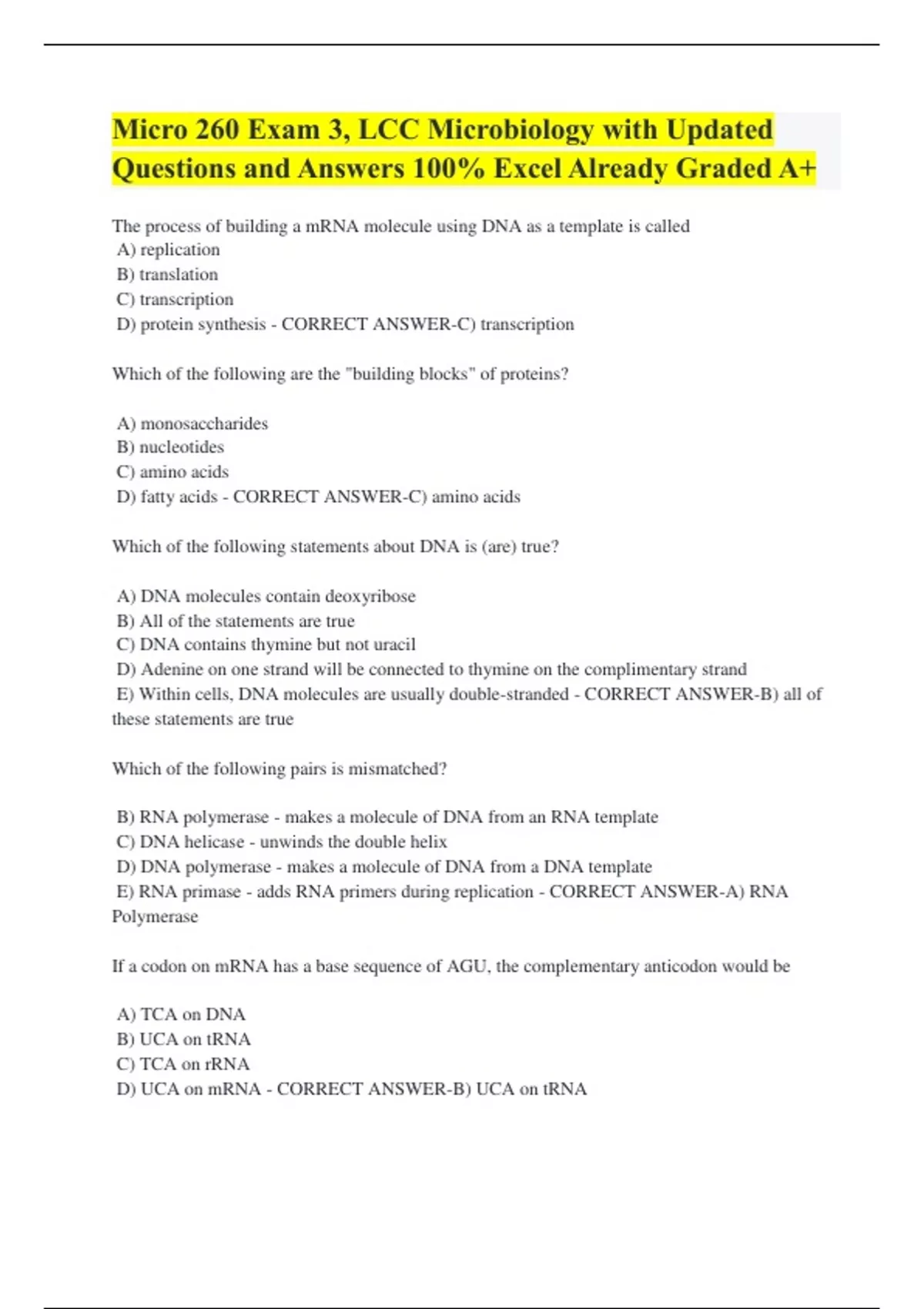 Micro 260 Exam 3, LCC Microbiology with Updated Questions and Answers 100% Excel Already Graded A+ The process of building a mRNA molecule using DNA as a template is called A) replication B) translation C) transcription D) protein synthesis - CORRECT ANSWER-C) transcription Which of the following are the "building blocks" of proteins? A) monosaccharides B) nucleotides C) amino acids D) fatty acids - CORRECT ANSWER-C) amino acids Which of the following statements about DNA is (are) true? A) DNA molecules contain deoxyribose B) All of the statements are true C) DNA contains thymine but not uracil D) Adenine on one strand will be connected to thymine on the complimentary strand E) Within cells, DNA molecules are usually double-stranded - CORRECT ANSWER-B) all of these statements are true Which of the following pairs is mismatched? B) RNA polymerase - makes a molecule of DNA from an RNA template C) DNA helicase - unwinds the double helix D) DNA polymerase - makes a molecule of DNA from a DNA template E) RNA primase - adds RNA primers during replication - CORRECT ANSWER-A) RNA Polymerase If a codon on mRNA has a base sequence of AGU, the complementary anticodon would be A) TCA on DNA B) UCA on tRNA C) TCA on rRNA D) UCA on mRNA - CORRECT ANSWER-B) UCA on tRNA Thymine dimers are a common mutation resulting from A) mutagenic chemicals B) spontaneous mutations C) frameshift mutation D) ultraviolet light - CORRECT ANSWER-D) ultraviolet light If the sequence of bases on the template strand of DNA is 3' CCTACGGACGA 5', what is the sequence of bases on the complimentary DNA strand? (Type your answer in the same format: beginning with 5', using capital letters and including spaces) This segment of DNA is from the beginning of a gene. - CORRECT ANSWER-5' GGATGCCTGCT 3' GGATGCCTGCT 5' GGATGCCTGCT