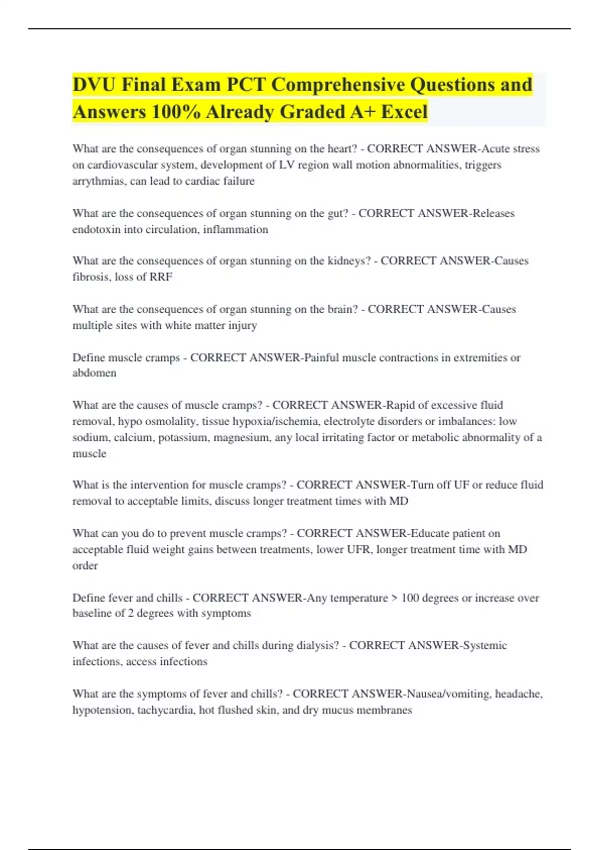 DVU Final Exam PCT Comprehensive Questions and Answers 100% Already Graded A+ Excel What are the consequences of organ stunning on the heart? - CORRECT ANSWER-Acute stress on cardiovascular system, development of LV region wall motion abnormalities, triggers arrythmias, can lead to cardiac failure What are the consequences of organ stunning on the gut? - CORRECT ANSWER-Releases endotoxin into circulation, inflammation What are the consequences of organ stunning on the kidneys? - CORRECT ANSWER-Causes fibrosis, loss of RRF What are the consequences of organ stunning on the brain? - CORRECT ANSWER-Causes multiple sites with white matter injury Define muscle cramps - CORRECT ANSWER-Painful muscle contractions in extremities or abdomen What are the causes of muscle cramps? - CORRECT ANSWER-Rapid of excessive fluid removal, hypo osmolality, tissue hypoxia/ischemia, electrolyte disorders or imbalances: low sodium, calcium, potassium, magnesium, any local irritating factor or metabolic abnormality of a muscle What is the intervention for muscle cramps? - CORRECT ANSWER-Turn off UF or reduce fluid removal to acceptable limits, discuss longer treatment times with MD What can you do to prevent muscle cramps? - CORRECT ANSWER-Educate patient on acceptable fluid weight gains between treatments, lower UFR, longer treatment time with MD order Define fever and chills - CORRECT ANSWER-Any temperature > 100 degrees or increase over baseline of 2 degrees with symptoms What are the causes of fever and chills during dialysis? - CORRECT ANSWER-Systemic infections, access infections What are the symptoms of fever and chills? - CORRECT ANSWER-Nausea/vomiting, headache, hypotension, tachycardia, hot flushed skin, and dry mucus membranes What are the interventions for fever and chills? - CORRECT ANSWER-Nurse must assess and evaluate patient for possible cause of fever. If ordered by physician, obtain blood cultures per procedure and send to lab. Provide comfort measures and administer antipyretics as ordered. Administer antibiotics as ordered. Schedule patient for permanent access evaluation. How can you prevent fever and chills? - CORRECT ANSWER-Avoid use of femoral catheters, evaluate teammates technique What is a pyrogenic reaction? - CORRECT ANSWER-Pyrogenic (fever) reaction is caused by pyrogens, such as endotoxins What are the causes of a pyrogenic reaction? - CORRECT ANSWER-Break in water treatment or if there is an endotoxin in a reprocessed dialyzer What are the symptoms of a pyrogenic reaction? - CORRECT ANSWER-Chills, shaking fever, hypotension, vomiting, muscle pain What is the intervention for a pyrogenic reaction? - CORRECT ANSWER-Stop treatment, obtain cultures and LAL's from dialyzers, dialysate per policy. Notify charge nurse and physician and implement orders received. Document occurrences, treatment, and patient response. Sequester dialyzer, blood lines for possible testing. Place in red bag. Label with patient name, date, and "NOT FOR PATIENT USE." Store in lab refrigerator. How can you prevent a pyrogenic reaction? - CORRECT ANSWER-Proper water treatment and disinfection of equipment. Proper reuse procedures. Proper preparation of dialysate. Proper machine set up and priming. Define seizures - CORRECT ANSWER-Involuntary muscle spasms and loss of consciousness What are the causes of seizures in dialysis patients during treatment? - CORRECT ANSWER-Sever hypotension, dialysis disequilibrium syndrome, or an adverse reaction to a problem such as the use of improperly prepared dialysate. Electrolyte/ acid base balance or imbalance, hypotension, hypovolemia, hypoglycemia, hypoxemia, intracranial bleeding hastened by heparin, removal of anticonvulsants by HD, hemodynamic instability including rapid change in BP, severe hypertension, too rapid transfusion What are the symptoms of seizures? - CORRECT ANSWER-Change in level of consciousness, twitching and jerking movements of the extremities. What is the intervention for seizures? - CORRECT ANSWER-A licensed nurse will assess a patient to determine cause and intervention to protect the patient from harm. In general, intervention includes: reduction of UFR and administration of NS if hypotensive, D/C dialysis if no response. O2 administration, termination of HD in severe cases, provision of airway support, obtaining labs for glucose, calcium and other electrolytes with MD orders. How can you prevent seizures? - CORRECT ANSWER-Dialysis should not have been initiated without notifying a nurse and a nursing assessment- including notifying the nephrologist. What is dialysis disequilibrium syndrome? - CORRECT ANSWER-A condition in which rapid or drastic changes in the patients extracellular fluid affect the brain. What are the causes of dialysis disequilibrium syndrome? - CORRECT ANSWER-Urea transfers more slowly from the brain tissue to the blood, so fluid is drawn into the brain causing swelling via osmosis. This can occur in AKI patients of when BUN levels are very high, missed treatments What are the symptoms of DDS? - CORRECT ANSWER-Headache, hypertension, nausea, restlessness, seizures, confusion, blurred vision What is the intervention for DDS? - CORRECT ANSWER-Decrease efficiency of dialysis with MD order (decrease BFr and DFR, decrease treatment time, shorter more frequent treatments How can you prevent DDS? - CORRECT ANSWER-Early recognition of mild symptoms. Decrease efficiency by: less efficient dialyzer, decreased treatment time, decreased BFR and DFR, and shorter, more frequent dilaysis treatment Blood loss - CORRECT ANSWER-Any loss of blood during the dialysis process. The fist covers a surface area of blood that equals 20 mL of blood. What are the causes of blood loss during treatment? - CORRECT ANSWER-Arterial of venous blood line separation, dialyzer leak or rupture, needle dislodgment, clotting of extracorporeal system What are the symptoms of blood loss? - CORRECT ANSWER-Blood on floor, chair, or clothing. Blood leak detector alarm. VP al