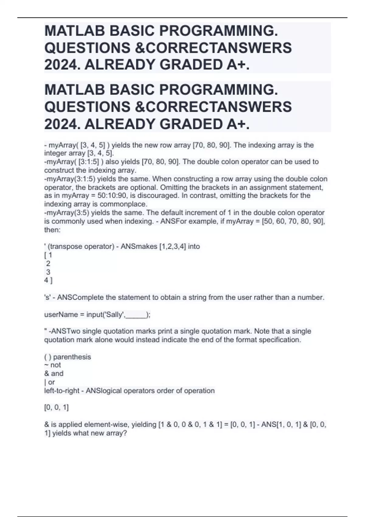 MATLAB BASIC PROGRAMMING. QUESTIONS &CORRECTANSWERS 2024. ALREADY GRADED A+.