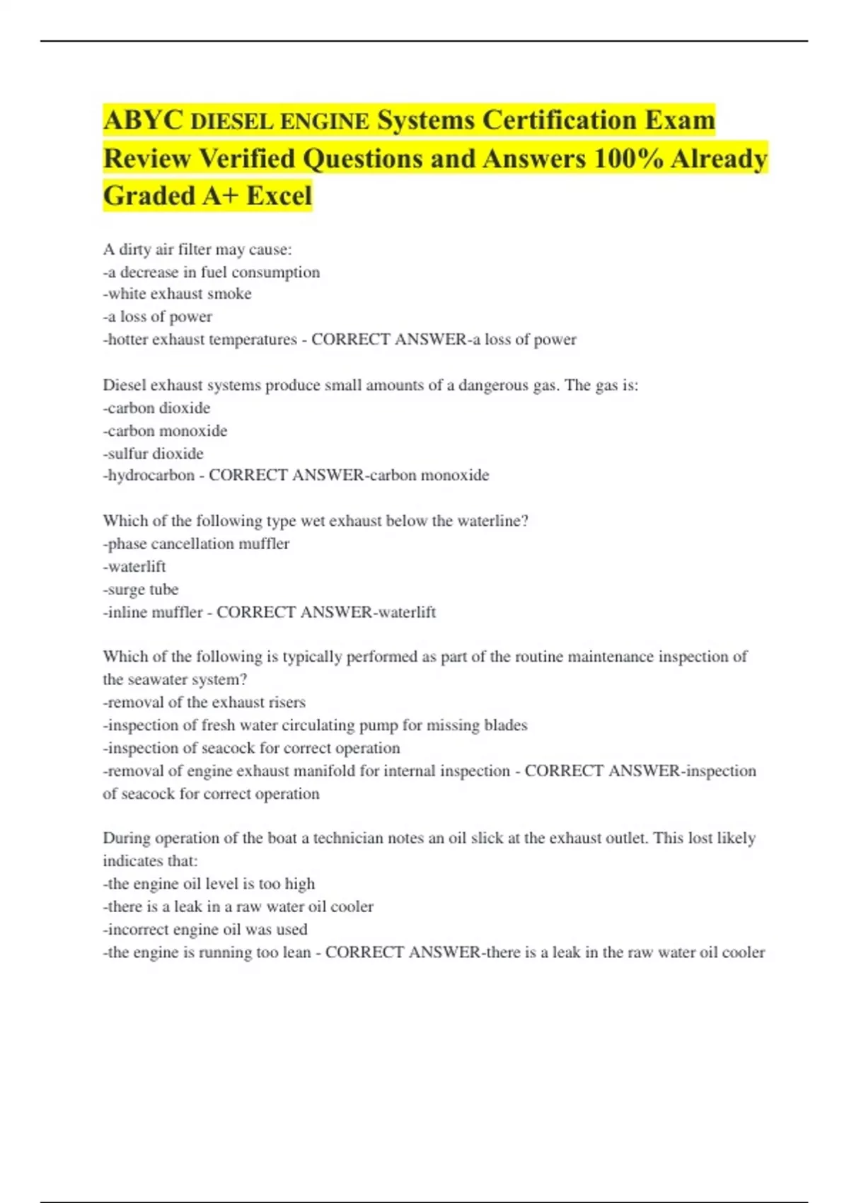 ABYC DIESEL ENGINE Systems Certification Exam Review Verified Questions and Answers 100% Already Graded A+ Excel A dirty air filter may cause: -a decrease in fuel consumption -white exhaust smoke -a loss of power -hotter exhaust temperatures - CORRECT ANSWER-a loss of power Diesel exhaust systems produce small amounts of a dangerous gas. The gas is: -carbon dioxide -carbon monoxide -sulfur dioxide -hydrocarbon - CORRECT ANSWER-carbon monoxide Which of the following type wet exhaust below the waterline? -phase cancellation muffler -waterlift -surge tube -inline muffler - CORRECT ANSWER-waterlift Which of the following is typically performed as part of the routine maintenance inspection of the seawater system? -removal of the exhaust risers -inspection of fresh water circulating pump for missing blades -inspection of seacock for correct operation -removal of engine exhaust manifold for internal inspection - CORRECT ANSWER-inspection of seacock for correct operation During operation of the boat a technician notes an oil slick at the exhaust outlet. This lost likely indicates that: -the engine oil level is too high -there is a leak in a raw water oil cooler -incorrect engine oil was used -the engine is running too lean - CORRECT ANSWER-there is a leak in the raw water oil cooler During an inspection of a closed cooling system the technician finds oil mixed in with the cooling solution. What step should be taken next? -remove the heat exchanger for servicing -identify and test any oil coolers in the system -flush the cooling system -take a sample of the coolant for testing - CORRECT ANSWER-identify and test any oil coolers in the system On engines with closed cooling systems, what solutions should be used in the engine block? -ethylene glycol -propylene glycol -as per manufacturer's specification -Benzene - CORRECT ANSWER-as per manufacturer's specification Premature failure of a pump drive belt may be caused by: -corrosion on the drive surfaces of the pulley -incorrect impeller -excessive coolant concentration -lack of belt dressing - CORRECT ANSWER-corrosion on the drive surfaces of the pulley The owner complains that the throttle handle will not hold position. What adjustment might correct this problem? -neutral detent adjustment -throttle friction adjustment at the control head -lubricate the cable -engine throttle lever adjustment - CORRECT ANSWER-throttle friction adjustment at the control head* The first component to check when testing a 12-volt direct current starting circuit is the -switch -regulator -battery -wiring - CORRECT ANSWER-battery An average charging circuit voltage on a 12-volt lead acid system is ________. -7.5 to 8.4 -11.5 to 13.3 -13.8 to 14.8 -14.9 to 16.1 - CORRECT ANSWER-13.8 to 14.8 Compared to gasoline, diesel fuel is more susceptible to -microbe contamination -algae growth contamination -phase separation -silicate dropout - CORRECT ANSWER-microbe contamination The most frequent cause of diesel engine problems is due to -improper air source -engine improperly tuned -fuel contamination -high operating temperature - CORRECT ANSWER-fuel contamination A leak in piping connections between the turbocharger and engine intake manifold could cause the engine to -miss -burn oil -emit dark or black exhaust -overheat - CORRECT ANSWER-emit dark or black exhaust What color smoke indicates excessive lube oil consumption in a diesel engine? -blue -white -black -gray - CORRECT ANSWER-blue Black soot around the engine compartment openings might indicate which of the following? Dirty fuel filter Insufficient engine room ventilation Improper fuel pump timing High exhaust back pressure - CORRECT ANSWER-Insufficient engine room ventilation If the engine does not achieve full rpm, which of these tests would be the LAST to be performed? Compression check Engine room depression test Boost pressure test Fuel inlet restriction test - CORRECT ANSWER-compression check The exhaust blower switch is activated but the sound coming from the blower is not normal. After a period of time, the breaker trips. Which of the following is the MOST likely cause? Hose has disconnected Hose has been crushed Air inlet duct is underwater Blower motor armature bearings are seizing - CORRECT ANSWER-Blower motor armature bearings are seizing