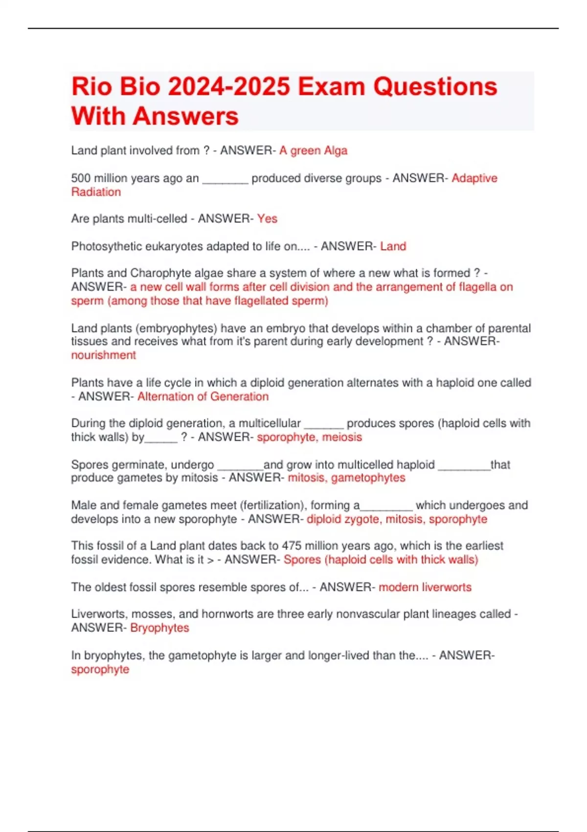 Rio Bio Exam Questions With Answers Land plant involved from ? - ANSWER- A green Alga 500 million years ago an _______ produced diverse groups - ANSWER- Adaptive Radiation Are plants multi-celled - ANSWER- Yes Photosythetic eukaryotes adapted to life on.... - ANSWER- Land Plants and Charophyte algae share a system of where a new what is formed ? - ANSWER- a new cell wall forms after cell division and the arrangement of flagella on sperm (among those that have flagellated sperm) Land plants (embryophytes) have an embryo that develops within a chamber of parental tissues and receives what from it's parent during early development ? - ANSWER- nourishment Plants have a life cycle in which a diploid generation alternates with a haploid one called - ANSWER- Alternation of Generation During the diploid generation, a multicellular ______ produces spores (haploid cells with thick walls) by_____ ? - ANSWER- sporophyte, meiosis Spores germinate, undergo _______and grow into multicelled haploid ________that produce gametes by mitosis - ANSWER- mitosis, gametophytes Male and female gametes meet (fertilization), forming a________ which undergoes and develops into a new sporophyte - ANSWER- diploid zygote, mitosis, sporophyte This fossil of a Land plant dates back to 475 million years ago, which is the earliest fossil evidence. What is it > - ANSWER- Spores (haploid cells with thick walls) The oldest fossil spores resemble spores of... - ANSWER- modern liverworts Liverworts, mosses, and hornworts are three early nonvascular plant lineages called - ANSWER- Bryophytes In bryophytes, the gametophyte is larger and longer-lived than the.... - ANSWER- sporophyte The first seedless vascular plants evolved about how many years ago ? - ANSWER- 430 million years ago In vascular plants, the_____ is larger and longer-lived than the______ and has specialized internal pipelines that transport_____ ? - ANSWER- sporophyte, gametophyte, water and sugars