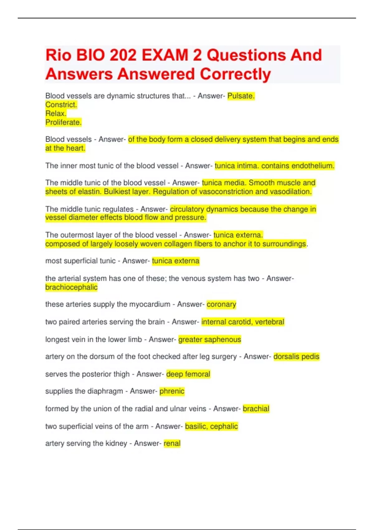 Rio BIO 202 EXAM 2 Questions And Answers Answered Correctly