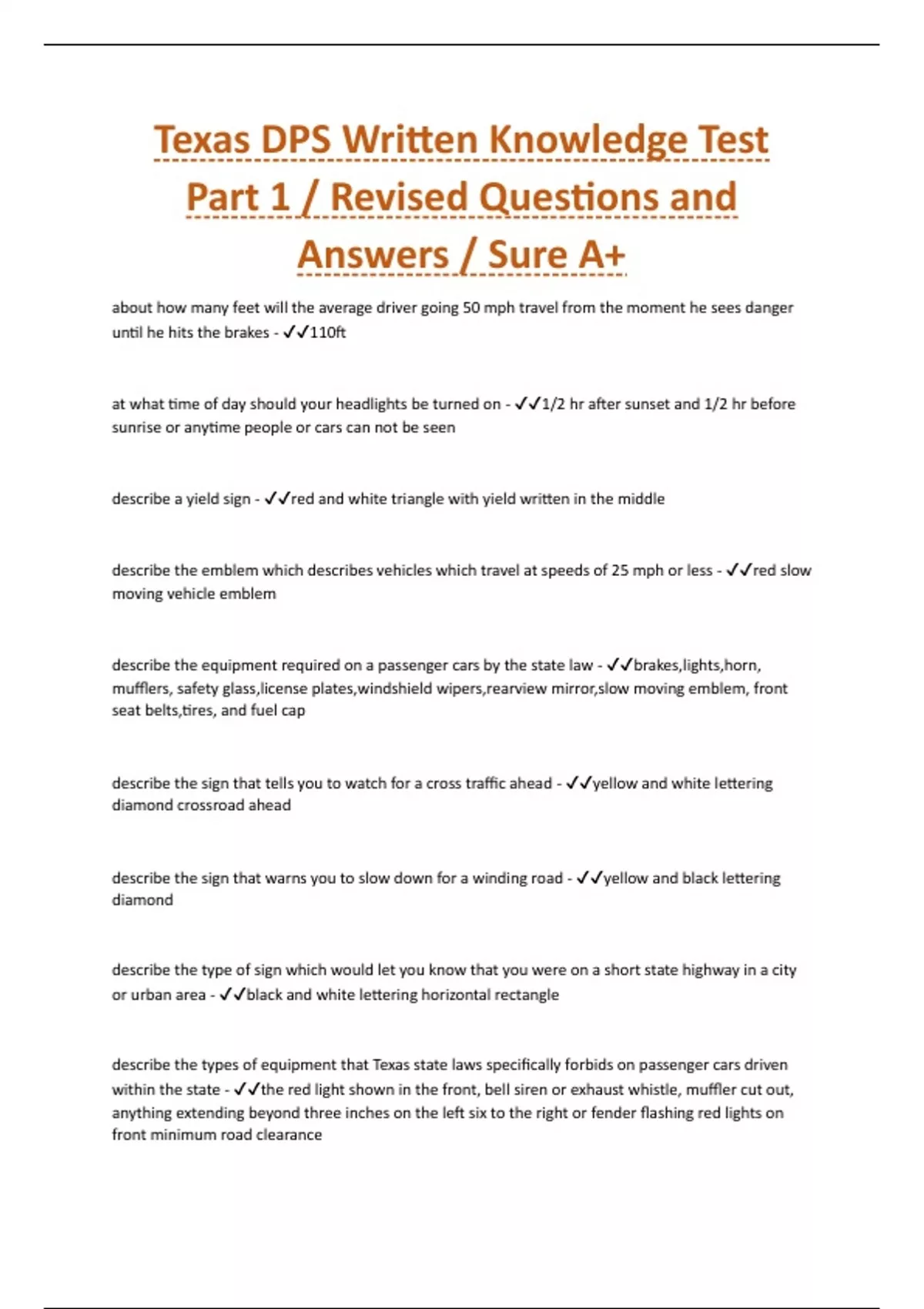 Texas DPS Written Knowledge Test Part 1 / Revised Questions and Answers / Sure A+