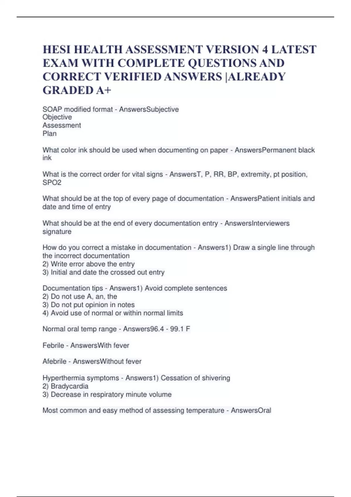 HESI HEALTH ASSESSMENT VERSION 4 LATEST EXAM WITH COMPLETE QUESTIONS AND CORRECT VERIFIED ANSWERS |ALREADY GRADED A+